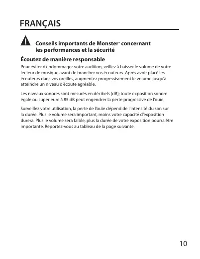 IMMERSION FRANÇAIS Conseils importants de Monster® concernant les performances et la sécurité Écoutez de manière responsable Pour éviter d’endommager votre audition, veillez à baisser le volume de votre lecteur de musique avant de brancher vos écouteurs. Après avoir placé les écouteurs dans vos oreilles, augmentez progressivement le volume jusqu’à atteindre un niveau d’écoute agréable. Les niveaux sonores sont mesurés en décibels (dB); toute exposition sonore égale ou supérieure à 85 dB peut engendrer la perte progressive de l’ouïe. Surveillez votre utilisation, la perte de l’ouïe dépend de l’intensité du son sur la durée. Plus le volume sera important, moins votre capacité d’exposition durera. Plus le volume sera faible, plus la durée de votre exposition pourra être importante. Reportez-vous au tableau de la page suivante.