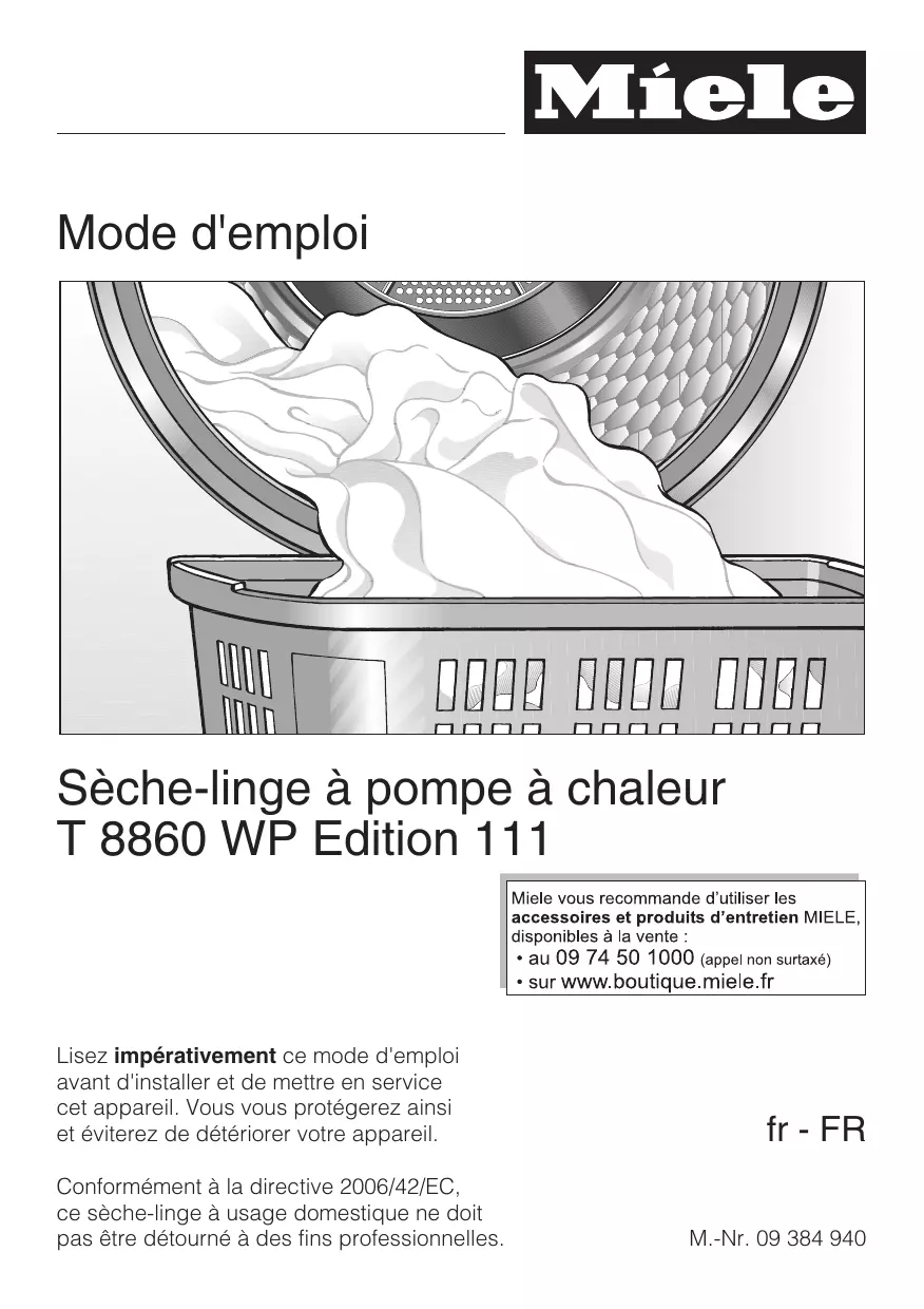 Mode d'emploi Sèche-linge à pompe à chaleur T 8860 WP Edition 111 Lisez impérativement ce mode d'emploi avant d'installer et de mettre en service cet appareil. Vous vous protégerez ainsi et éviterez de détériorer votre appareil. Conformément à la directive 2006/42/EC, ce sèche-linge à usage domestique ne doit pas être détourné à des fins professionnelles. fr - FR M.-Nr. 09 384 940 Votre contribution à la protection de l'environnement Enlèvement de l'emballage L'emballage protège votre sèche-linge des avaries de transport. Les matériaux utilisés sont choisis en fonction de critères écologiques de façon à en faciliter le recyclage. Le recyclage de l'emballage économise les matières premières et réduit le volume des déchets à éliminer. En principe, votre revendeur reprend l'emballage. Elimination de l'ancien appareil Les appareils électriques et électroniques contiennent souvent encore des matériaux recyclables. Ils contiennent également des matériaux nocifs, nécessaires au bon fonctionnement et à la sécurité de l'appareil. Ces matériaux peuvent être dangereux pour les hommes et l'environnement s'ils restent dans la collecte de déchets ou s'ils sont mal manipulés. Ne jetez par conséquent en aucun cas votre appareil avec les déchets. Faites appel au service d'enlèvement mis en place par votre commune ou rapportez votre appareil dans un point de collecte spécialement adaptés à l'évacuation de ce type d'appareil. Informez-vous le cas échéant auprès de votre revendeur.
