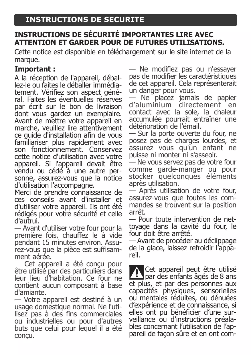 INSTRUCTIONS DE SÉCURITÉ IMPORTANTES LIRE AVEC ATTENTION ET GARDER POUR DE FUTURES UTILISATIONS. Cette notice est disponible en téléchargement sur le site internet de la marque. Important : — Ne modifiez pas ou n'essayer A la réception de l'appareil, débal- pas de modifier les caractéristiques lez-le ou faites le déballer immédia- de cet appareil. Cela représenterait tement. Vérifiez son aspect géné- un danger pour vous. ral. Faites les éventuelles réserves — Ne placez jamais de papier par écrit sur le bon de livraison d’aluminium directement en dont vous gardez un exemplaire. contact avec la sole, la chaleur Avant de mettre votre appareil en accumulée pourrait entraîner une marche, veuillez lire attentivement détérioration de l’émail. ce guide d'installation afin de vous — Sur la porte ouverte du four, ne familiariser plus rapidement avec posez pas de charges lourdes, et son fonctionnement. Conservez assurez vous qu'un enfant ne cette notice d'utilisation avec votre puisse ni monter ni s'asseoir. appareil. Si l'appareil devait être — Ne vous servez pas de votre four vendu ou cédé à une autre per- comme garde-manger ou pour sonne, assurez-vous que la notice stocker quelconques éléments après utilisation. d'utilisation l'accompagne. Merci de prendre connaissance de — Après utilisation de votre four, ces conseils avant d'installer et assurez-vous que toutes les comd'utiliser votre appareil. Ils ont été mandes se trouvent sur la position rédigés pour votre sécurité et celle arrêt. — Pour toute intervention de netd'autrui. — Avant d'utiliser votre four pour la toyage dans la cavité du four, le première fois, chauffez le à vide four doit être arrêté. pendant 15 minutes environ. Assu- — Avant de procéder au déclippage rez-vous que la pièce est suffisam- de la glace, laissez refroidir l’appareil. ment aérée. — Cet appareil a été conçu pour Cet appareil peut être utilisé être utilisé par des particuliers dans par des enfants âgés de 8 ans leur lieu d’habitation. Ce four ne contient aucun composant à base et plus, et par des personnes aux capacités physiques, sensorielles d'amiante. — Votre appareil est destiné à un ou mentales réduites, ou dénuées usage domestique normal. Ne l'uti- d’expérience et de connaissance, si lisez pas à des fins commerciales elles ont pu bénéficier d’une surou industrielles ou pour d'autres veillance ou d’instructions préalabuts que celui pour lequel il a été bles concernant l’utilisation de l’appareil de façon sûre et en ont comconçu. FRANÇAIS