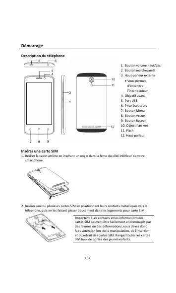 Important ! Les contacts et les informations des cartes SIM peuvent être facilement endommagés par des rayures ou des déformations, vous devez donc faire attention lors de la manipulation, de l'insertion et du retrait des cartes SIM. Rangez toutes les cartes SIM hors de portée des jeunes enfants.