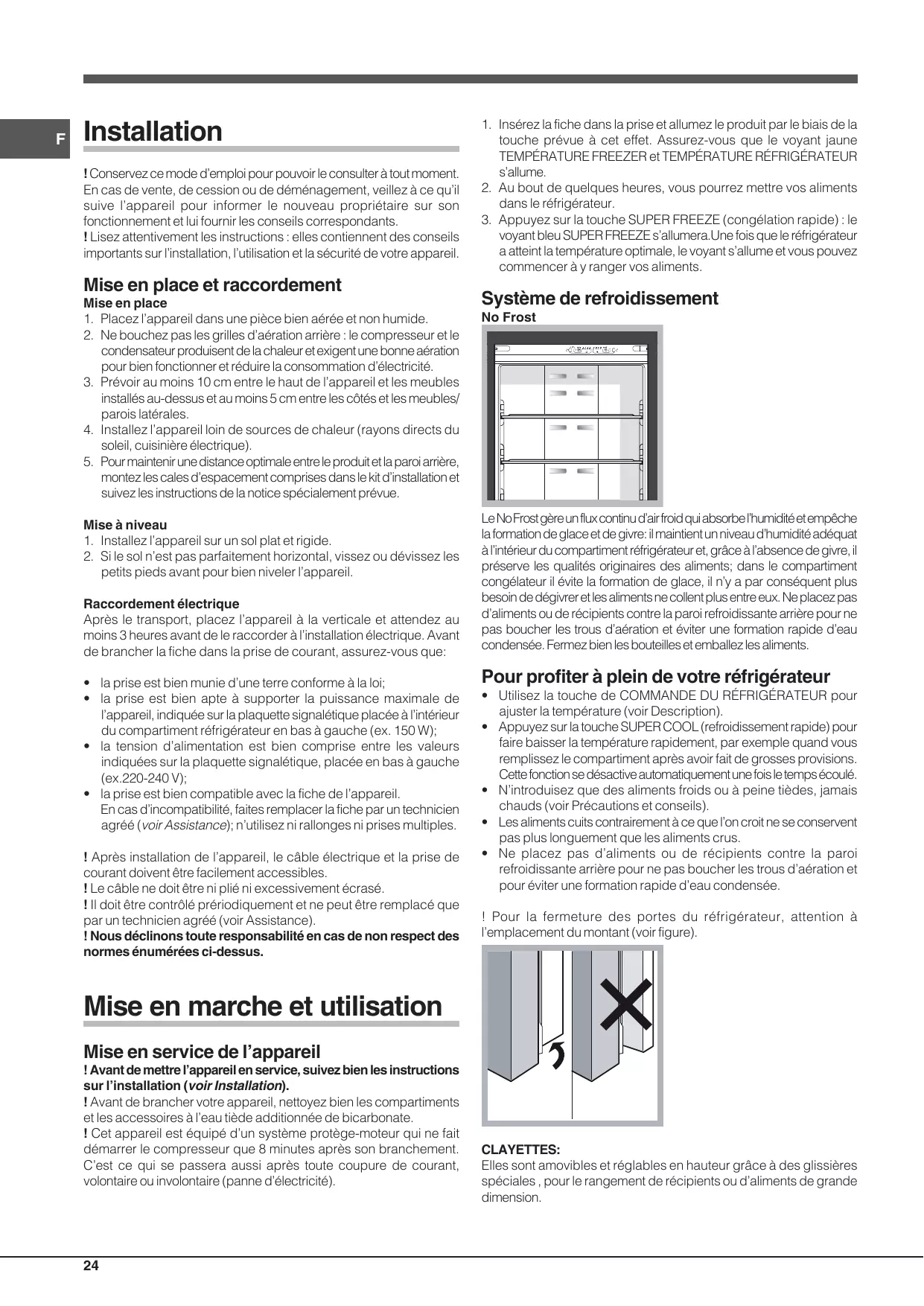 voyant bleu SUPER FREEZE s’allumera.Une fois que le réfrigérateur a atteint la température optimale, le voyant s’allume et vous pouvez commencer à y ranger vos aliments. Système de refroidissement No Frost Le No Frost gère un flux continu d’air froid qui absorbe l’humidité et empêche la formation de glace et de givre: il maintient un niveau d’humidité adéquat à l’intérieur du compartiment réfrigérateur et, grâce à l’absence de givre, il préserve les qualités originaires des aliments; dans le compartiment congélateur il évite la formation de glace, il n’y a par conséquent plus besoin de dégivrer et les aliments ne collent plus entre eux. Ne placez pas d’aliments ou de récipients contre la paroi refroidissante arrière pour ne pas boucher les trous d’aération et éviter une formation rapide d’eau condensée. Fermez bien les bouteilles et emballez les aliments. Pour profiter à plein de votre réfrigérateur