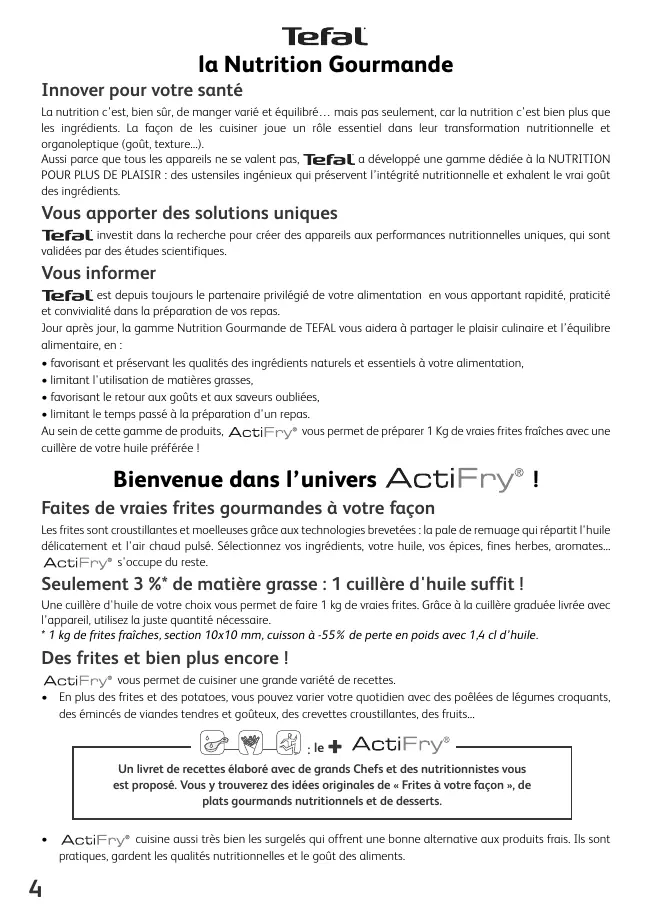 fig. 13 fig. 14 fig. 15 la Nutrition Gourmande Innover pour votre santé La nutrition c’est, bien sûr, de manger varié et équilibré… mais pas seulement, car la nutrition c’est bien plus que les ingrédients. La façon de les cuisiner joue un rôle essentiel dans leur transformation nutritionnelle et organoleptique (goût, texture...). Aussi parce que tous les appareils ne se valent pas, a développé une gamme dédiée à la NUTRITION POUR PLUS DE PLAISIR : des ustensiles ingénieux qui préservent l’intégrité nutritionnelle et exhalent le vrai goût des ingrédients. Vous apporter des solutions uniques investit dans la recherche pour créer des appareils aux performances nutritionnelles uniques, qui sont validées par des études scientifiques. Vous informer est depuis toujours le partenaire privilégié de votre alimentation en vous apportant rapidité, praticité et convivialité dans la préparation de vos repas. Jour après jour, la gamme Nutrition Gourmande de TEFAL vous aidera à partager le plaisir culinaire et l’équilibre alimentaire, en :