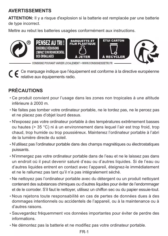 Ne faites pas tomber votre ordinateur portable, ne le tordez pas, ne le percez pas et ne placez pas d’objet lourd dessus. N'exposez pas votre ordinateur portable à des températures extrêmement basses ou hautes (> 35 °C) ni à un environnement dans lequel l’air est trop froid, trop chaud, trop humide ou trop poussiéreux. Maintenez l’ordinateur portable à l’abri de la lumière directe du soleil. N’utilisez pas l’ordinateur portable dans des champs magnétiques ou électrostatiques puissants. N’immergez pas votre ordinateur portable dans de l’eau et ne le laissez pas dans un endroit où il peut devenir saturé d’eau ou d’autres liquides. Si de l’eau ou d’autres liquides entrent en contact avec l’appareil, éteignez-le immédiatement et ne le rallumez pas tant qu’il n’a pas intégralement séché. Ne nettoyez pas l’ordinateur portable avec du détergent ou un produit nettoyant contenant des substances chimiques ou d’autres liquides pour éviter de l’endommager et de le corroder. S’il faut le nettoyer, utilisez un chiffon sec ou du papier essuie-tout. Nous rejetons toute responsabilité en cas de pertes de données dues à des dommages intentionnels ou accidentels de l’appareil, ou à la maintenance ou à d’autres raisons. Sauvegardez fréquemment vos données importantes pour éviter de perdre des informations. Ne démontez pas la batterie et ne modifiez pas votre ordinateur portable.