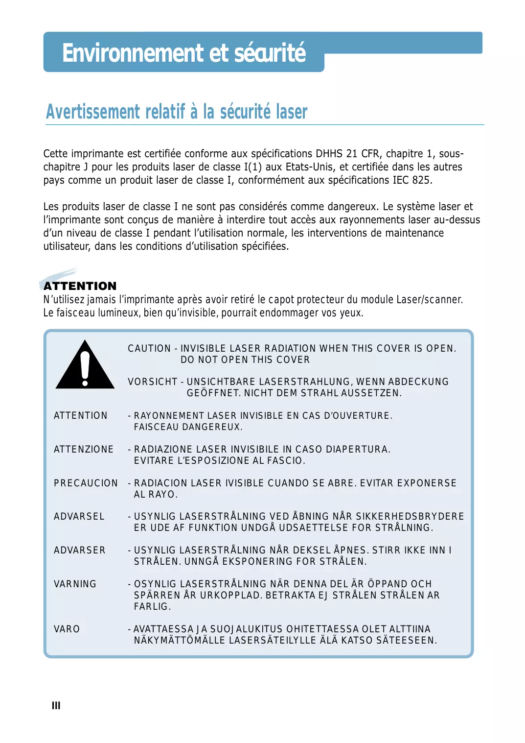 Environnement et sécurité Avertissement relatif à la sécurité laser Cette imprimante est certifiée conforme aux spécifications DHHS 21 CFR, chapitre 1, souschapitre J pour les produits laser de classe I(1) aux Etats-Unis, et certifiée dans les autres pays comme un produit laser de classe I, conformément aux spécifications IEC 825. Les produits laser de classe I ne sont pas considérés comme dangereux. Le système laser et l’imprimante sont conçus de manière à interdire tout accès aux rayonnements laser au-dessus d’un niveau de classe I pendant l’utilisation normale, les interventions de maintenance utilisateur, dans les conditions d’utilisation spécifiées. ATTENTION N’utilisez jamais l’imprimante après avoir retiré le capot protecteur du module Laser/scanner. Le faisceau lumineux, bien qu’invisible, pourrait endommager vos yeux. CAUTION - INVISIBLE LASER RADIATION WHEN THIS COVER IS OPEN.