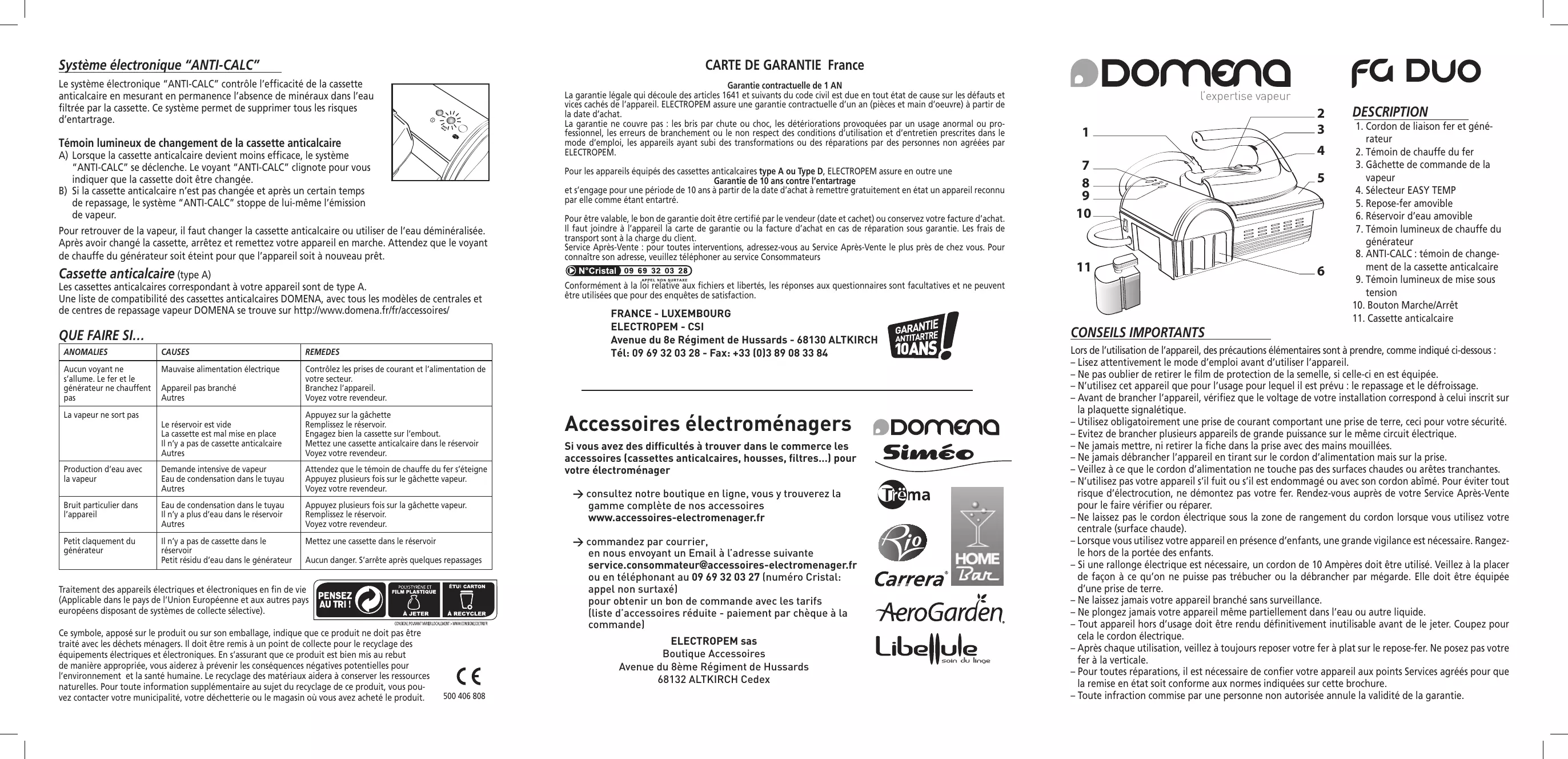 ANOMALIES CAUSES REMEDES Aucun voyant ne s’allume. Le fer et le générateur ne chauffent pas Mauvaise alimentation électrique Appareil pas branché Autres Contrôlez les prises de courant et l’alimentation de votre secteur. Branchez l’appareil. Voyez votre revendeur. Le réservoir est vide La cassette est mal mise en place Il n’y a pas de cassette anticalcaire Autres Appuyez sur la gâchette Remplissez le réservoir. Engagez bien la cassette sur l’embout. Mettez une cassette anticalcaire dans le réservoir Voyez votre revendeur. Production d’eau avec la vapeur Demande intensive de vapeur Eau de condensation dans le tuyau Autres Attendez que le témoin de chauffe du fer s’éteigne Appuyez plusieurs fois sur le gâchette vapeur. Voyez votre revendeur. Bruit particulier dans l’appareil Eau de condensation dans le tuyau Il n’y a plus d’eau dans le réservoir Autres Appuyez plusieurs fois sur la gâchette vapeur. Remplissez le réservoir. Voyez votre revendeur. Petit claquement du générateur Il n’y a pas de cassette dans le réservoir Petit résidu d’eau dans le générateur Mettez une cassette dans le réservoir La vapeur ne sort pas Aucun danger. S’arrête après quelques repassages Traitement des appareils électriques et électroniques en fin de vie (Applicable dans le pays de l’Union Européenne et aux autres pays européens disposant de systèmes de collecte sélective). Ce symbole, apposé sur le produit ou sur son emballage, indique que ce produit ne doit pas être traité avec les déchets ménagers. Il doit être remis à un point de collecte pour le recyclage des équipements électriques et électroniques. En s’assurant que ce produit est bien mis au rebut de manière appropriée, vous aiderez à prévenir les conséquences négatives potentielles pour l’environnement et la santé humaine. Le recyclage des matériaux aidera à conserver les ressources naturelles. Pour toute information supplémentaire au sujet du recyclage de ce produit, vous pouvez contacter votre municipalité, votre déchetterie ou le magasin où vous avez acheté le produit. Garantie contractuelle de 1 AN La garantie légale qui découle des articles 1641 et suivants du code civil est due en tout état de cause sur les défauts et vices cachés de l’appareil. ELECTROPEM assure une garantie contractuelle d’un an (pièces et main d’oeuvre) à partir de la date d’achat. La garantie ne couvre pas : les bris par chute ou choc, les détériorations provoquées par un usage anormal ou professionnel, les erreurs de branchement ou le non respect des conditions d’utilisation et d’entretien prescrites dans le mode d’emploi, les appareils ayant subi des transformations ou des réparations par des personnes non agréées par ELECTROPEM. Pour les appareils équipés des cassettes anticalcaires type A ou Type D, ELECTROPEM assure en outre une Garantie de 10 ans contre l’entartrage et s’engage pour une période de 10 ans à partir de la date d’achat à remettre gratuitement en état un appareil reconnu par elle comme étant entartré. Pour être valable, le bon de garantie doit être certifié par le vendeur (date et cachet) ou conservez votre facture d’achat. Il faut joindre à l’appareil la carte de garantie ou la facture d’achat en cas de réparation sous garantie. Les frais de transport sont à la charge du client. Service Après-Vente : pour toutes interventions, adressez-vous au Service Après-Vente le plus près de chez vous. Pour connaître son adresse, veuillez téléphoner au service Consommateurs