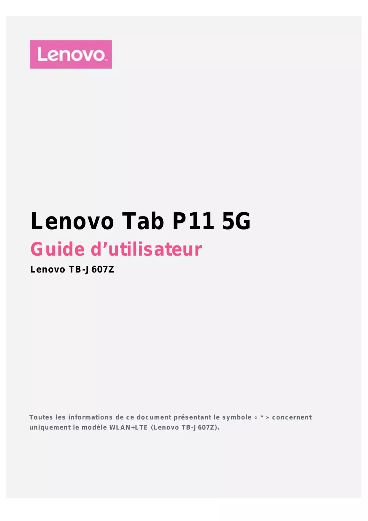 Lenovo TB-J607Z Toutes les informations de ce document présentant le symbole « * » concernent uniquement le modèle WLAN+LTE (Lenovo TB-J607Z).