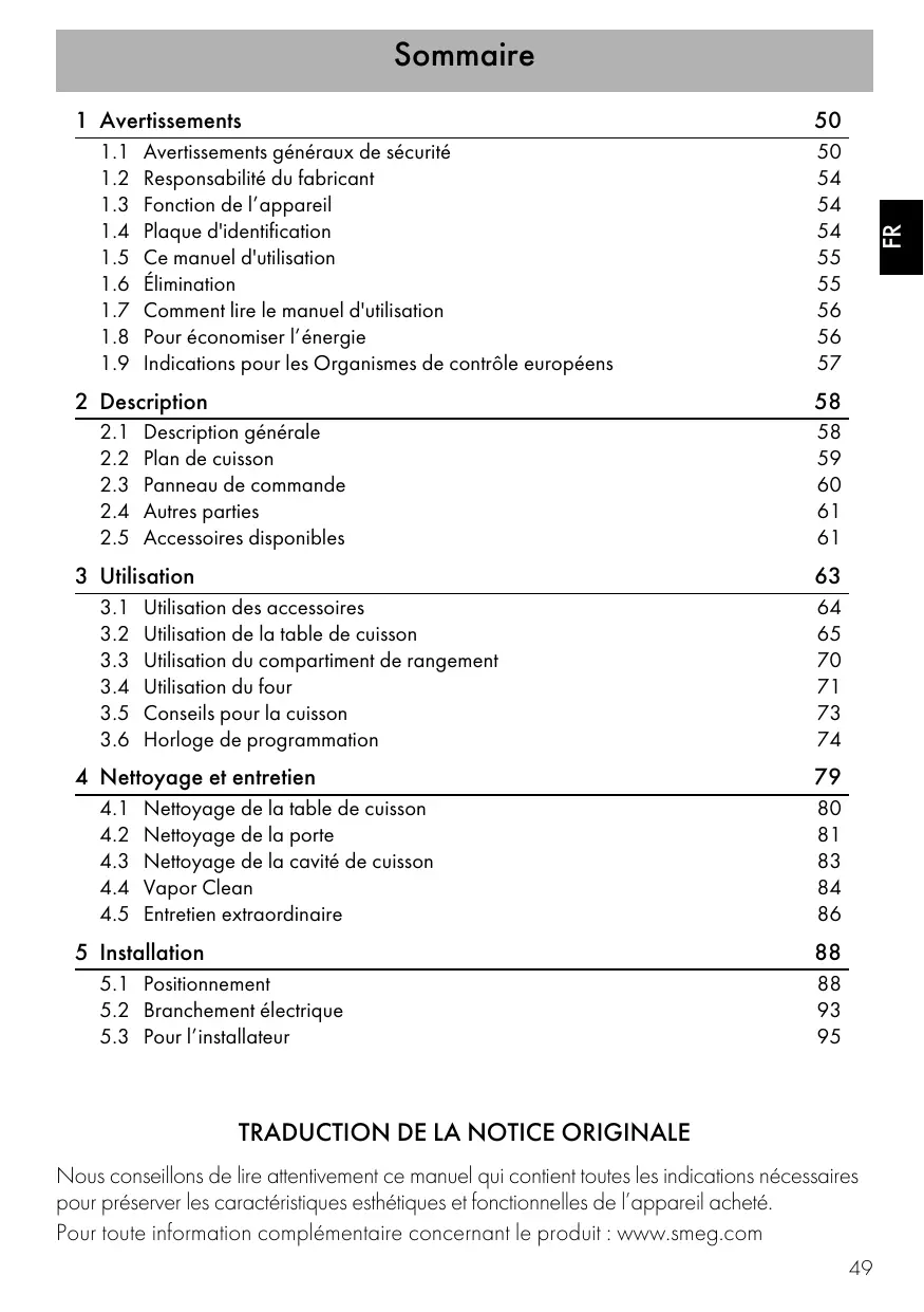 TRADUCTION DE LA NOTICE ORIGINALE Nous conseillons de lire attentivement ce manuel qui contient toutes les indications nécessaires pour préserver les caractéristiques esthétiques et fonctionnelles de l’appareil acheté. Pour toute information complémentaire concernant le produit : www.smeg.com 49