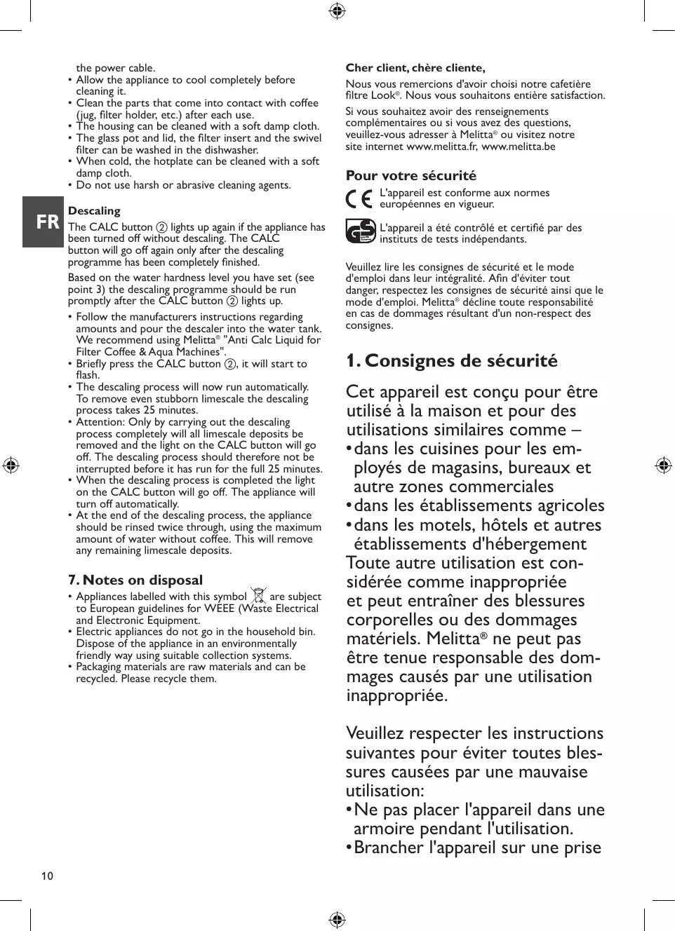 L'appareil est conforme aux normes européennes en vigueur. L'appareil a été contrôlé et certifié par des instituts de tests indépendants. Veuillez lire les consignes de sécurité et le mode d'emploi dans leur intégralité. Afin d'éviter tout danger, respectez les consignes de sécurité ainsi que le mode d'emploi. Melitta® décline toute responsabilité en cas de dommages résultant d'un non-respect des consignes.