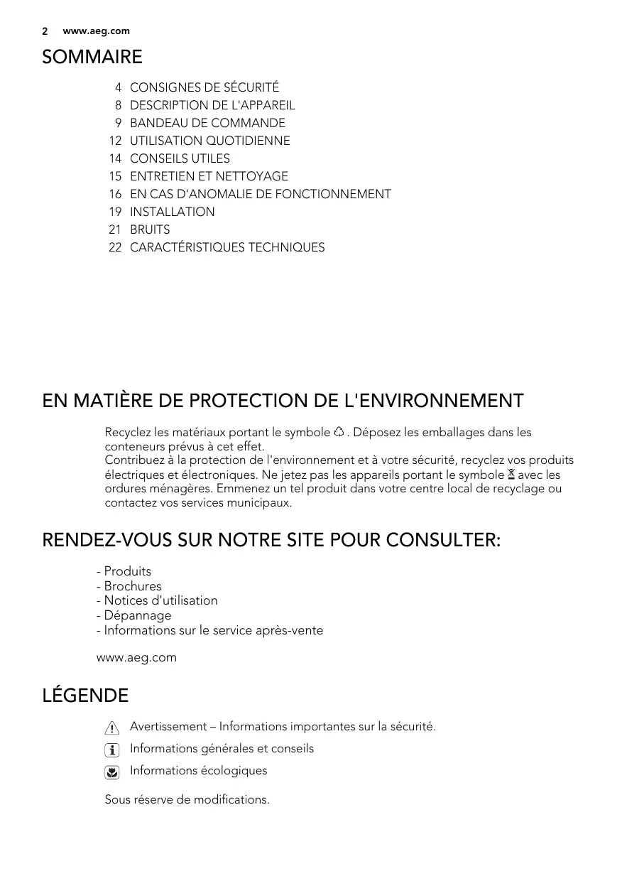 RENDEZ-VOUS SUR NOTRE SITE POUR CONSULTER: - Produits - Brochures - Notices d'utilisation - Dépannage - Informations sur le service après-vente www.aeg.com