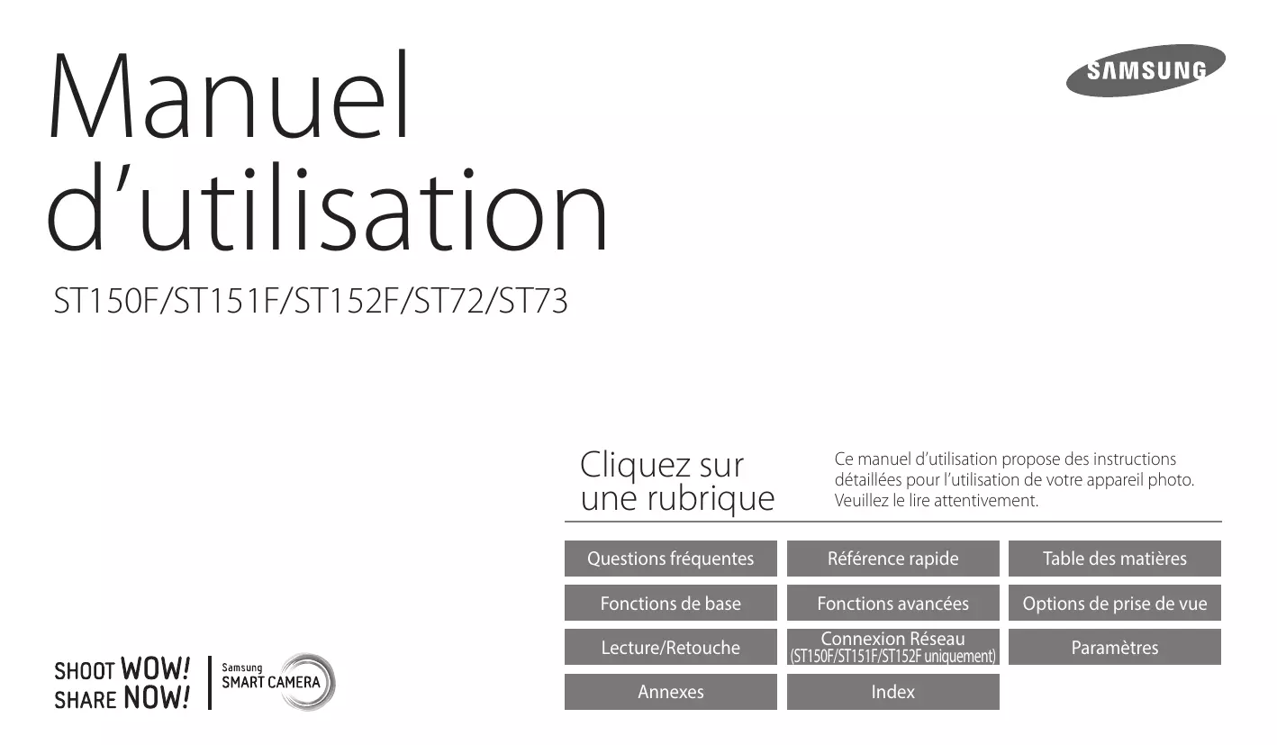 ST152F (support Wi-Fi) sont utilisées dans ce mode d’emploi. Bien que certaines fonctionnalités des modèles ST150F/ST151F/ST152F (support Wi-Fi) et ST72/ST73 diffèrent, ces appareils fonctionnent de manière semblable, sauf en ce qui concerne la fonction Wi-Fi. Les caractéristiques de l’appareil ou le contenu de ce manuel d’utilisation peuvent faire l’objet de modifications sans préavis, suite à l’évolution des fonctions de l’appareil. Nous vous recommandons d’utiliser votre appareil photo dans le pays dans lequel vous l’avez acheté. Utilisez cet appareil photo de manière responsable et veillez à respecter toutes les législations et règlementations en vigueur. La distribution ou la réutilisation du contenu de ce manuel d’utilisation, même partielle, sans autorisation préalable, est interdite.