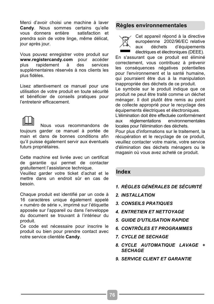 Bei der Nutzung von phosphatfreien Waschmitteln können folgende Dinge resultieren: Merci d’avoir choisi une machine à laver Candy. Nous sommes certains qu’elle vous donnera entière satisfaction et prendra soin de votre linge, même délicat, jour après jour. Règles environnementales Cet appareil répond à la directive européenne 2002/96/EC relative aux déchets d’équipements électriques et électroniques (DEEE). En s'assurant que ce produit est éliminé correctement, vous contribuez à prévenir les conséquences négatives potentielles pour l'environnement et la santé humaine, qui pourraient être dus à la manipulation inappropriée des déchets de ce produit. Le symbole sur le produit indique que ce produit ne peut être traité comme un déchet ménager. Il doit plutôt être remis au point de collecte approprié pour le recyclage des équipements électriques et électroniques. L'élimination doit être effectuée conformément aux réglementations environnementales locales pour l'élimination des déchets. Pour plus d'informations sur le traitement, la récupération et le recyclage de ce produit, veuillez contacter votre mairie, votre service d'élimination des déchets ménagers ou le magasin où vous avez acheté ce produit. Vous pouvez enregistrer votre produit sur www.registercandy.com pour accéder plus rapidement des services supplémentaires réservés à nos clients les plus fidèles. Lisez attentivement ce manuel pour une utilisation de votre produit en toute sécurité et bénéficier de conseils pratiques pour l’entretenir efficacement. Nous vous recommandons de toujours garder ce manuel à portée de main et dans de bonnes conditions afin qu’il puisse également servir aux éventuels futurs propriétaires. Cette machine est livrée avec un certificat de garantie qui permet de contacter gratuitement l’assistance technique. Veuillez garder votre ticket d’achat et le mettre dans un endroit sûr en cas de besoin. Index
