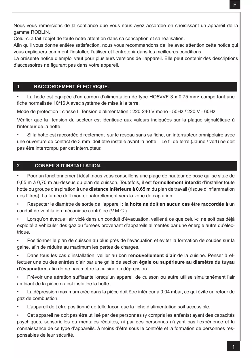 Nous vous remercions de la confiance que vous nous avez accordée en choisissant un appareil de la gamme ROBLIN. Celui-ci a fait l’objet de toute notre attention dans sa conception et sa réalisation. Afin qu’il vous donne entière satisfaction, nous vous recommandons de lire avec attention cette notice qui vous expliquera comment l’installer, l’utiliser et l’entretenir dans les meilleures conditions. La présente notice d’emploi vaut pour plusieurs versions de l’appareil. Elle peut contenir des descriptions d’accessoires ne figurant pas dans votre appareil.