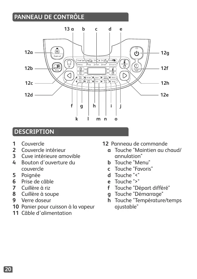12 Panneau de commande a Touche "Maintien au chaud/ annulation" b Touche "Menu" c Touche "Favoris" d Touche "<" e Touche ">" f Touche "Départ différé" g Touche "Démarrage" h Touche "Température/temps ajustable"