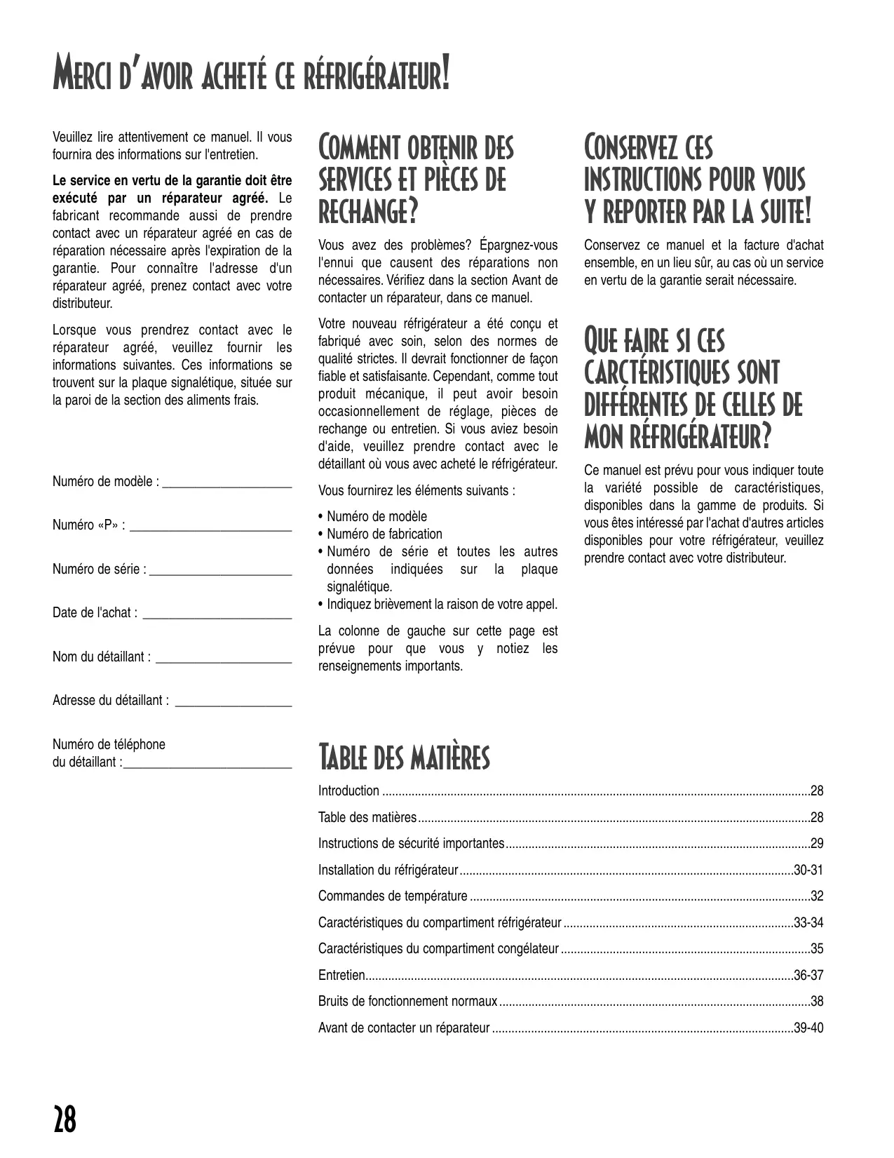 - Indiquez brièvement la raison de votre appel. Ce manuel est prévu pour vous indiquer toute la variété possible de caractéristiques, disponibles dans la gamme de produits. Si vous êtes intéressé par l'achat d'autres articles disponibles pour votre réfrigérateur, veuillez prendre contact avec votre distributeur. La colonne de gauche sur cette page est prévue pour que vous y notiez les renseignements importants. Adresse du détaillant : __________________ Numéro de téléphone du détaillant :__________________________ Table des matières Introduction ....................................................................................................................................28 Table des matières.........................................................................................................................28 Instructions de sécurité importantes..............................................................................................29 Installation du réfrigérateur .......................................................................................................30-31 Commandes de température .........................................................................................................32 Caractéristiques du compartiment réfrigérateur .......................................................................33-34 Caractéristiques du compartiment congélateur .............................................................................35 Entretien....................................................................................................................................36-37 Bruits de fonctionnement normaux ................................................................................................38 Avant de contacter un réparateur .............................................................................................39-40