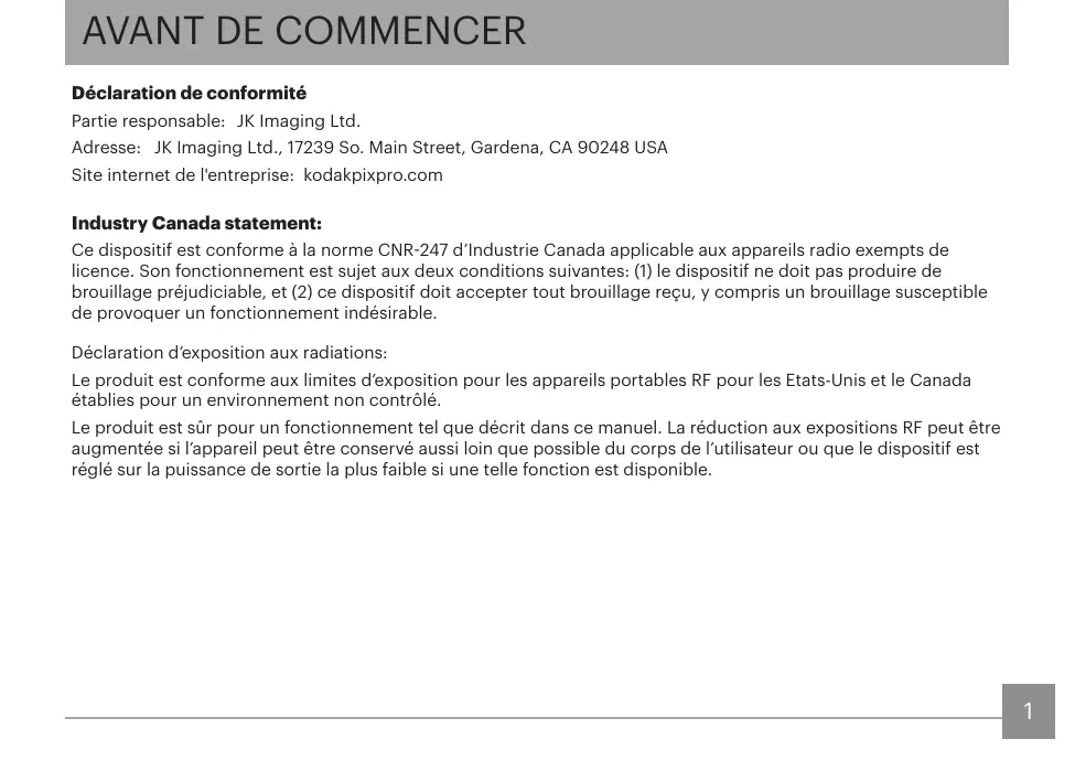 AVANT DE COMMENCER Déclaration de conformité Partie responsable: JK Imaging Ltd. Adresse: JK Imaging Ltd., 17239 So. Main Street, Gardena, CA 90248 USA Site internet de l'entreprise: kodakpixpro.com