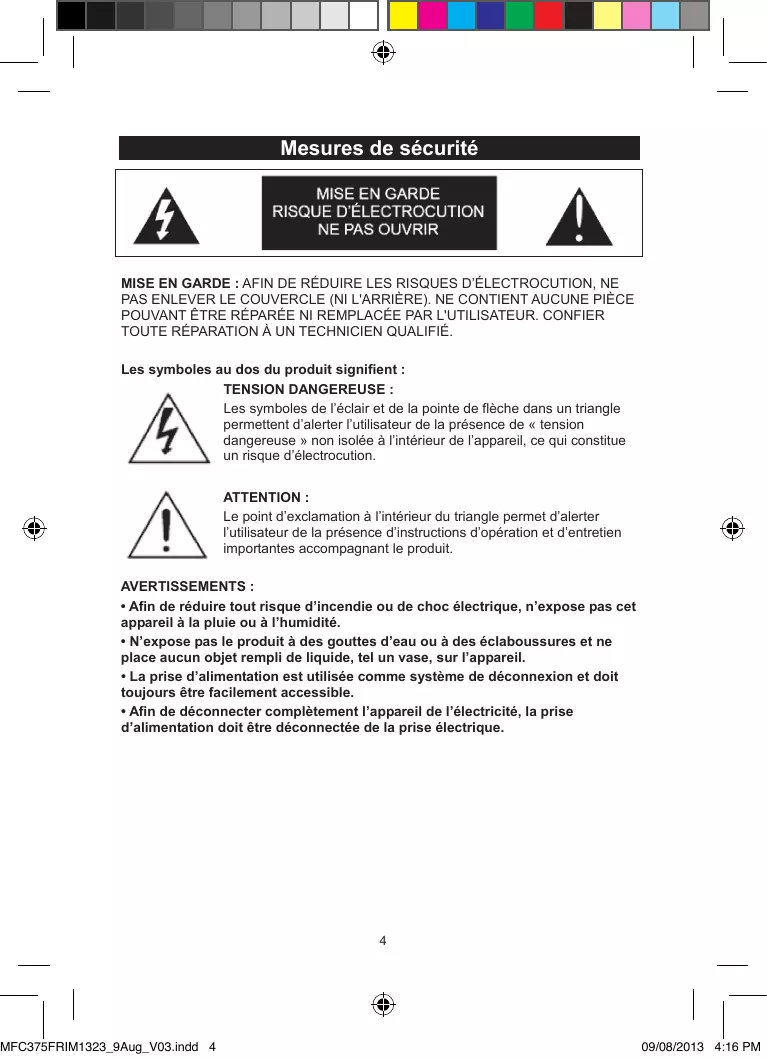 - Afin de déconnecter complètement l’appareil de l’électricité, la prise d’alimentation doit être déconnectée de la prise électrique. MFC375FRIM1323_9Aug_V03.indd 4