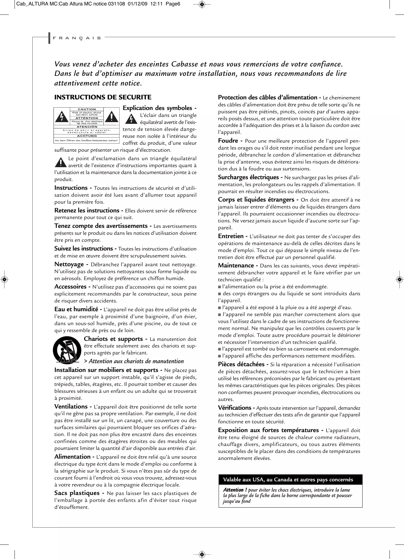■ La disposition des enceintes dans des niches est également en général à proscrire car elle modifie la courbe de réponse de l’enceinte, particulièrement dans les fréquences basses. S’il est impossible d’adopter une autre disposition, on doit veiller à ce que l’enceinte s’encastre avec le minimum de jeu dans la niche, pour éviter l’apparition de résonances diverses. Par ailleurs, la partie visible du tissu devra être à l’extérieur de la niche. MARQUAGE DEEE Traitement des appareils électriques et électroniques en fin de vie (applicable dans les pays de l’Union européenne). Ce symbole, représentant une poubelle sur roues barrée d’une croix, apposé sur le produit, indique que ce produit ne doit pas être traité avec les déchets ménagers. Il doit être remis à un point de collecte pour le traitement des équipements élec- Cab_ALTURA MC:Cab Altura MC notice 031108 01/12/09 12:11 Page8 f r a n ç a i s triques et électroniques en fin de vie. En s’assurant que ce produit est bien mis au rebut de manière appropriée, vous aiderez à prévenir les conséquences négatives potentielles pour l’environnement et la santé humaine. Le recyclage des matériaux aidera à conserver les ressources naturelles. Pour toute information supplémentaire au sujet du recyclage de ce produit, vous pouvez contacter votre municipalité, votre déchetterie ou le magasin où vous avez acheté le produit. SPÉCIFICATIONS