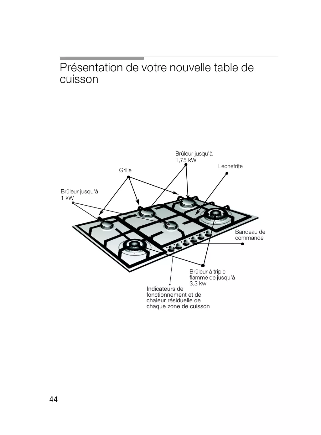 Si l'allumage ne se produit pas, l'indicateur de fonctionnement clignotera. Tournez la commande jusqu'à la position puis répétez l'opération. Pour éteindre, tournez le bouton vers la droite jusqu'à la position . L'indicateur correspondant à la zone de cuisson clignotera brièvement puis restera allumé ce qui indique des température élevées dans la zone de cuisson. Si la flamme de la zone de cuisson s'éteint accidentellement, le système automatique d'allumage s'activera. Votre table de cuisson moderne et fonctionnelle dispose de robinets progressifs qui permettent de trouver le réglage nécessaire entre la flamme maximum et minimum. Selon le modèle, votre table de cuisson peut disposer d'un brûleur à triple flamme, très pratique et commode pour cuisiner avec des poêles à paella, Wok chinois (toute sorte de plats asiatiques) etc. L'utilisation de l'appareil à gaz produit de la chaleur et de l'humidité dans la pièce où il est installé. Vous devez veiller à une bonne ventilation de la cuisine : laissez les orifices de ventilation naturelle ouverts ou installez un dispositif de ventilation mécanique (hotte aspirante).