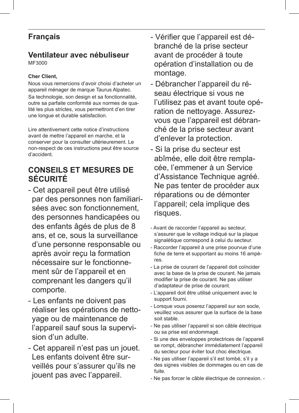 Nous vous remercions d'avoir choisi d'acheter un apparéil menager de marque Taurus Alpatec.