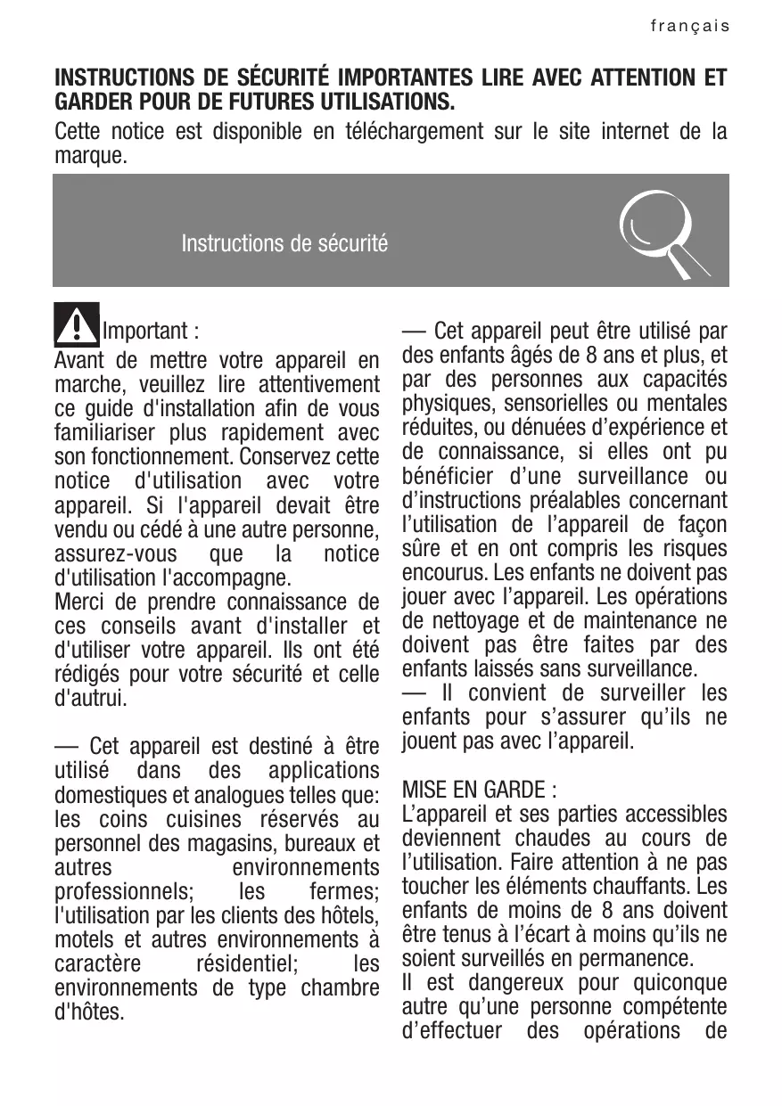 français INSTRUCTIONS DE SÉCURITÉ IMPORTANTES LIRE AVEC ATTENTION ET GARDER POUR DE FUTURES UTILISATIONS. Cette notice est disponible en téléchargement sur le site internet de la marque. Instructions de sécurité Important : Avant de mettre votre appareil en marche, veuillez lire attentivement ce guide d'installation afin de vous familiariser plus rapidement avec son fonctionnement. Conservez cette notice d'utilisation avec votre appareil. Si l'appareil devait être vendu ou cédé à une autre personne, assurez-vous que la notice d'utilisation l'accompagne. Merci de prendre connaissance de ces conseils avant d'installer et d'utiliser votre appareil. Ils ont été rédigés pour votre sécurité et celle d'autrui. — Cet appareil peut être utilisé par des enfants âgés de 8 ans et plus, et par des personnes aux capacités physiques, sensorielles ou mentales réduites, ou dénuées d’expérience et de connaissance, si elles ont pu bénéficier d’une surveillance ou d’instructions préalables concernant l’utilisation de l’appareil de façon sûre et en ont compris les risques encourus. Les enfants ne doivent pas jouer avec l’appareil. Les opérations de nettoyage et de maintenance ne doivent pas être faites par des enfants laissés sans surveillance. — Il convient de surveiller les enfants pour s’assurer qu’ils ne — Cet appareil est destiné à être jouent pas avec l’appareil. utilisé dans des applications domestiques et analogues telles que: MISE EN GARDE : les coins cuisines réservés au L’appareil et ses parties accessibles personnel des magasins, bureaux et deviennent chaudes au cours de autres environnements l’utilisation. Faire attention à ne pas professionnels; les fermes; toucher les éléments chauffants. Les l'utilisation par les clients des hôtels, enfants de moins de 8 ans doivent motels et autres environnements à être tenus à l’écart à moins qu’ils ne caractère résidentiel; les soient surveillés en permanence. environnements de type chambre Il est dangereux pour quiconque autre qu’une personne compétente d'hôtes. d’effectuer des opérations de français et les œufs durs entiers dans un four micro-ondes car ils risquent d’exploser, même après la fin de cuisson. — Cet appareil est conçu pour faire des cuissons porte fermée. — Le four à micro-ondes est prévu pour chauffer des denrées alimentaires et des boissons. Le séchage de denrées alimentaires ou de linge et le chauffage de coussins chauffants, pantoufles, éponges, linge humide et autres articles similaires peuvent entraîner risques blessures, — N’utilisez que des ustensiles des d’inflamation