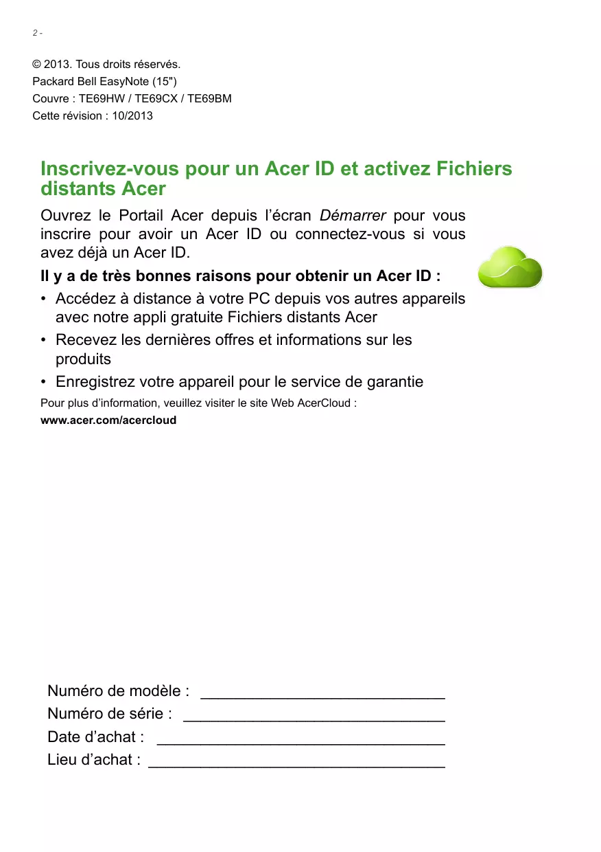 © 2013. Tous droits réservés. Packard Bell EasyNote (15") Couvre : TE69HW / TE69CX / TE69BM Cette révision : 10/2013 Inscrivez-vous pour un Acer ID et activez Fichiers distants Acer Ouvrez le Portail Acer depuis l’écran Démarrer pour vous inscrire pour avoir un Acer ID ou connectez-vous si vous avez déjà un Acer ID. Il y a de très bonnes raisons pour obtenir un Acer ID :