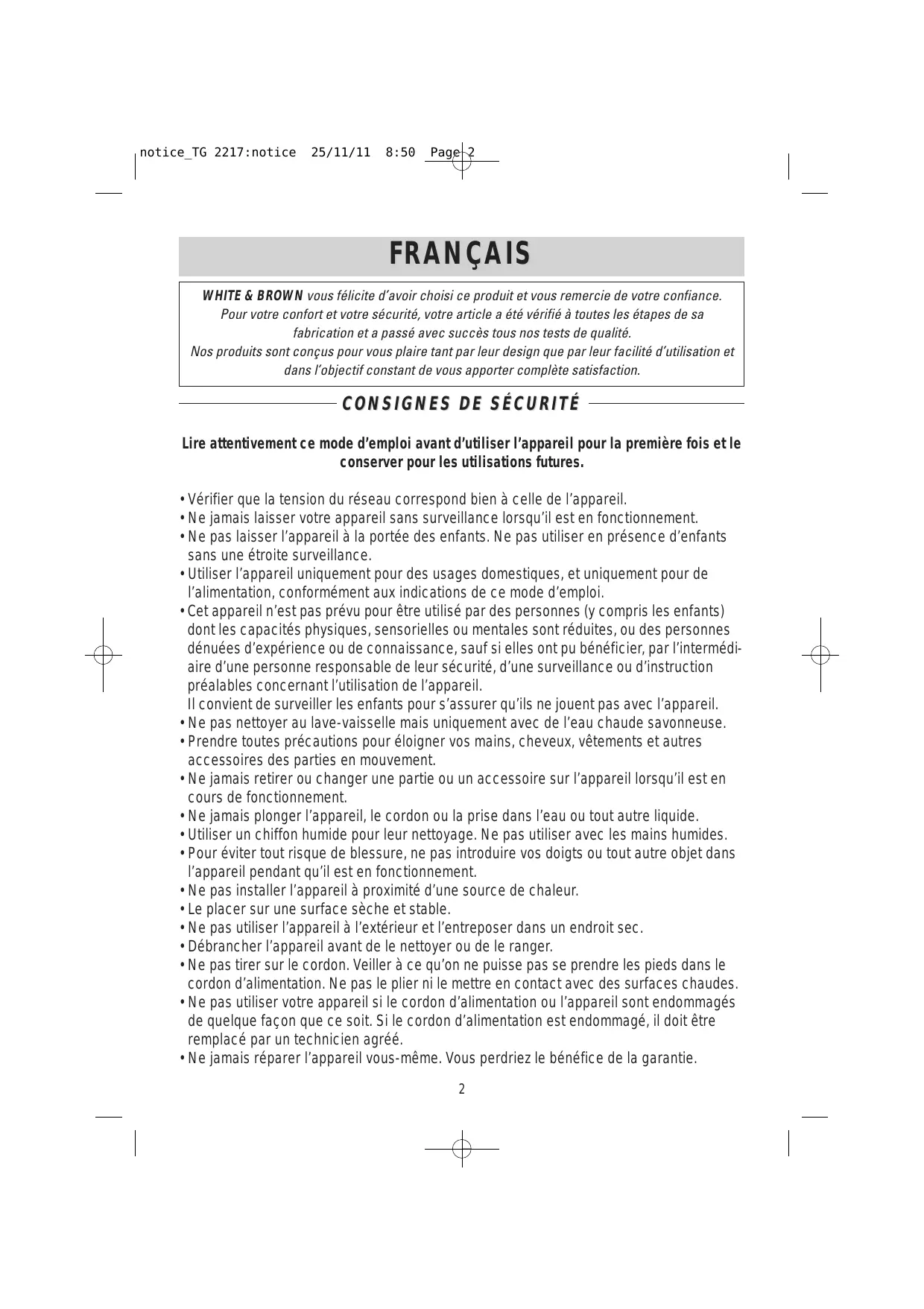 Téléchargez la notice de votre Appareil de cuisine au format PDF gratuitement ! Retrouvez votre notice 162217 - WHITE AND BROWN et reprennez votre appareil électronique en main. Sur cette page sont publiés tous les documents nécessaires à l'utilisation de votre appareil 162217 de la marque WHITE AND BROWN.