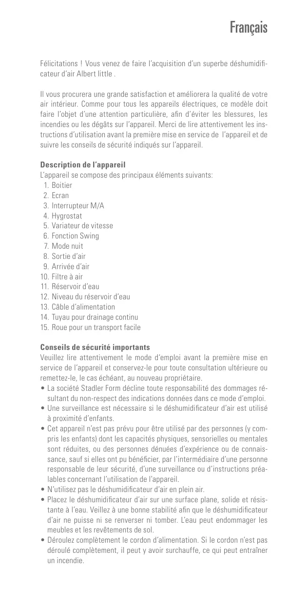 Français Félicitations ! Vous venez de faire l’acquisition d’un superbe déshumidificateur d’air Albert little . Il vous procurera une grande satisfaction et améliorera la qualité de votre air intérieur. Comme pour tous les appareils électriques, ce modèle doit faire l’objet d’une attention particulière, afin d’éviter les blessures, les incendies ou les dégâts sur l’appareil. Merci de lire attentivement les instructions d’utilisation avant la première mise en service de l’appareil et de suivre les conseils de sécurité indiqués sur l’appareil. Description de l’appareil L’appareil se compose des principaux éléments suivants: