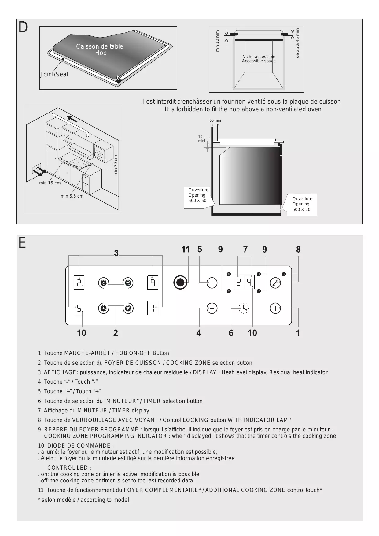 1 Touche MARCHE-ARRÊT / HOB ON-OFF Button 2 Touche de selection du FOYER DE CUISSON / COOKING ZONE selection button 3 AFFICHAGE: puissance, indicateur de chaleur résiduelle / DISPLAY : Heat level display, Residual heat indicator 4 Touche “-” / Touch “-” 5 Touche “+” / Touch “+” 6 Touche de selection du “MINUTEUR” / TIMER selection button 7 Affichage du MINUTEUR / TIMER display 8 Touche de VERROUILLAGE AVEC VOYANT / Control LOCKING button WITH INDICATOR LAMP 9 REPERE DU FOYER PROGRAMMÉ : lorsqu’il s’affiche, il indique que le foyer est pris en charge par le minuteur COOKING ZONE PROGRAMMING INDICATOR : when displayed, it shows that the timer controls the cooking zone 10 DIODE DE COMMANDE : . allumé: le foyer ou le minuteur est actif, une modification est possible, . éteint: le foyer ou la minuterie est figé sur la dernière information enregistrée CONTROL LED : . on: the cooking zone or timer is active, modification is possible . off: the cooking zone or timer is set to the last recorded data 11 Touche de fonctionnement du FOYER COMPLEMENTAIRE* / ADDITIONAL COOKING ZONE control touch*
