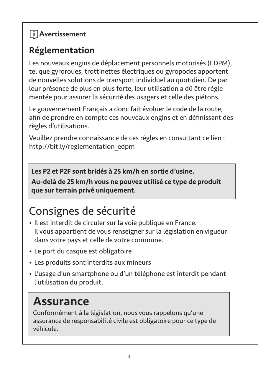 i Avertissement Réglementation Les nouveaux engins de déplacement personnels motorisés (EDPM), tel que gyroroues, trottinettes électriques ou gyropodes apportent de nouvelles solutions de transport individuel au quotidien. De par leur présence de plus en plus forte, leur utilisation a dû être réglementée pour assurer la sécurité des usagers et celle des piétons. Le gouvernement Français a donc fait évoluer le code de la route, afin de prendre en compte ces nouveaux engins et en définissant des règles d’utilisations. Veuillez prendre connaissance de ces règles en consultant ce lien : http://bit.ly/reglementation_edpm Les P2 et P2F sont bridés à 25 km/h en sortie d’usine. Au-delà de 25 km/h vous ne pouvez utilisé ce type de produit que sur terrain privé uniquement. Consignes de sécurité