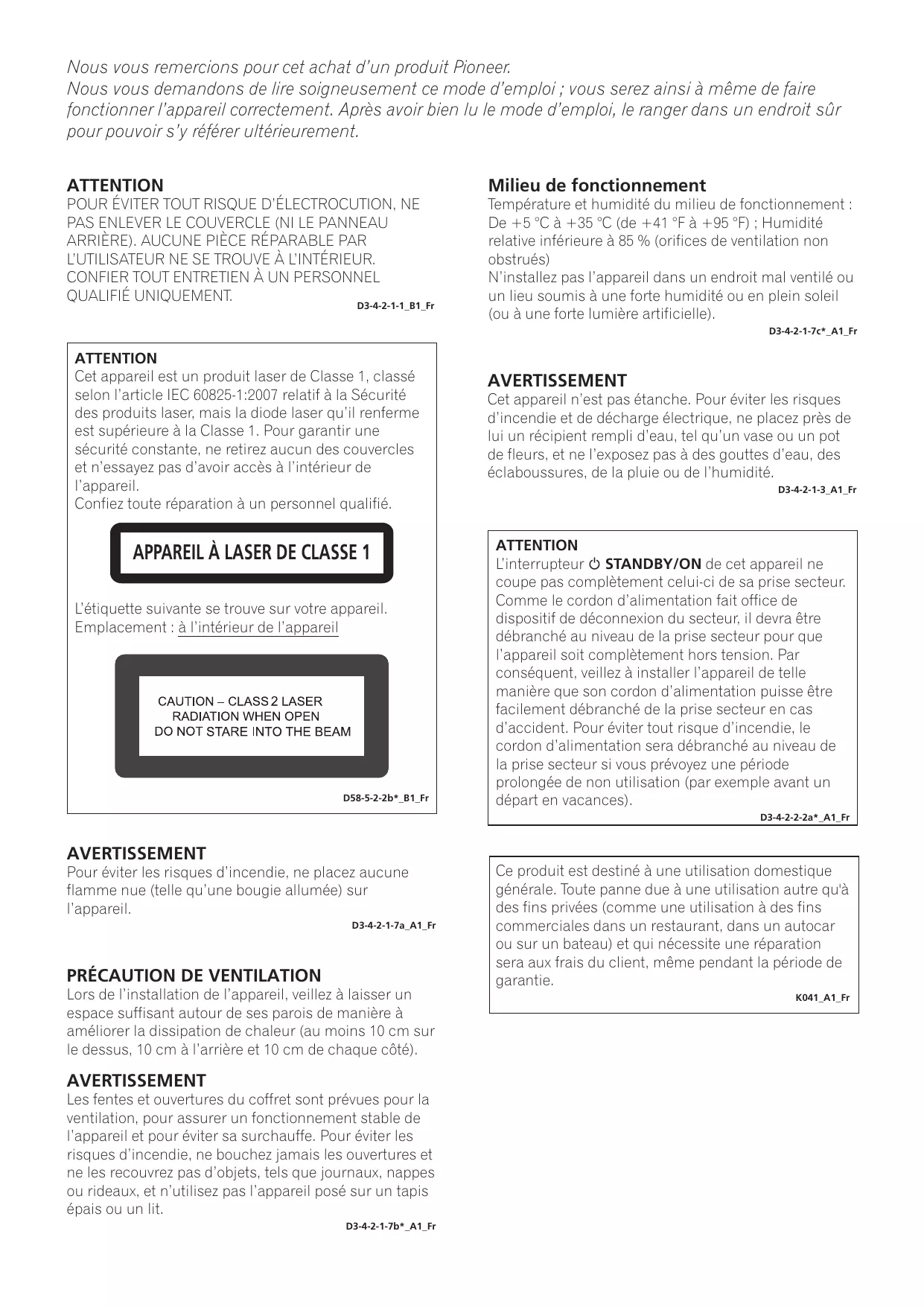 AVERTISSEMENT Cet appareil n’est pas étanche. Pour éviter les risques d’incendie et de décharge électrique, ne placez près de lui un récipient rempli d’eau, tel qu’un vase ou un pot de fleurs, et ne l’exposez pas à des gouttes d’eau, des éclaboussures, de la pluie ou de l’humidité. D3-4-2-1-3_A1_Fr