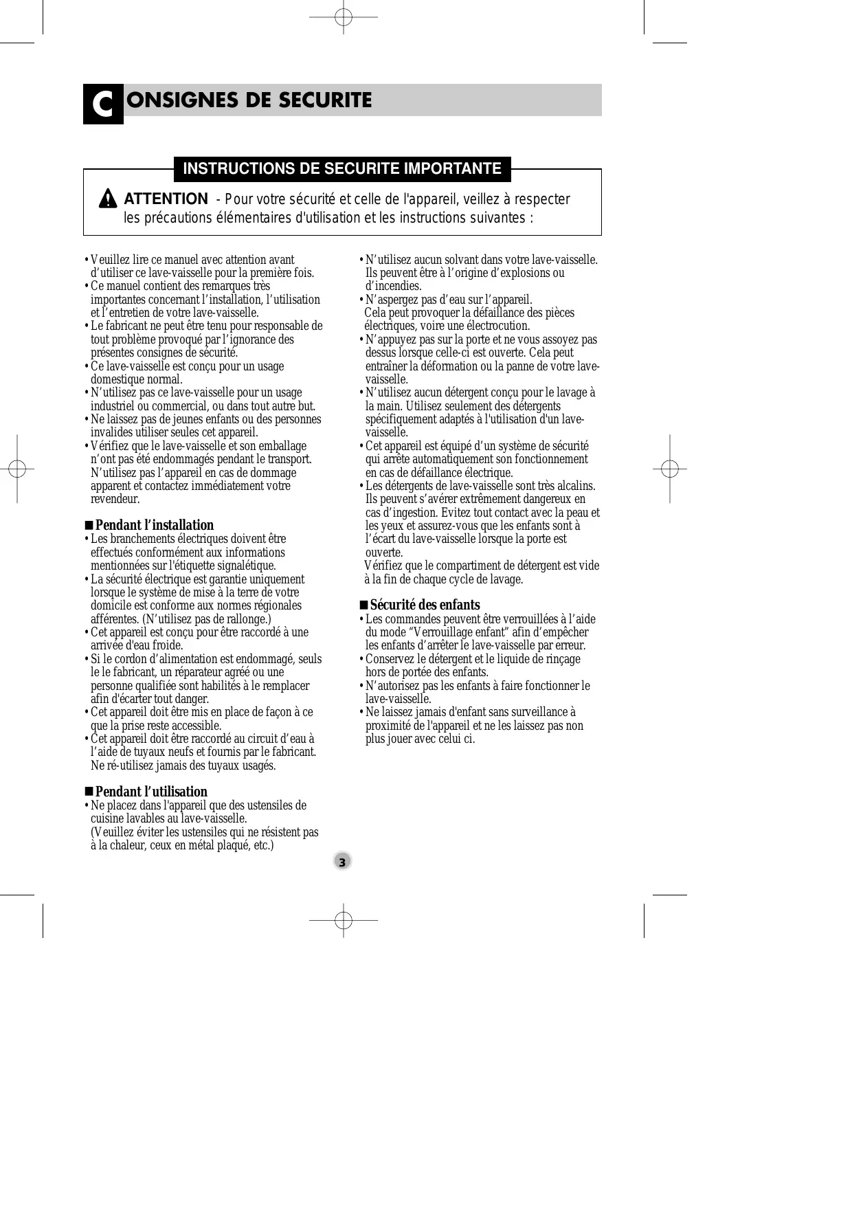 C ONSIGNES DE SECURITE INSTRUCTIONS DE SECURITE IMPORTANTE ATTENTION - Pour votre sécurité et celle de l'appareil, veillez à respecter les précautions élémentaires d'utilisation et les instructions suivantes : • N’utilisez aucun solvant dans votre lave-vaisselle. Ils peuvent être à l’origine d’explosions ou d’incendies. • N’aspergez pas d’eau sur l’appareil. Cela peut provoquer la défaillance des pièces électriques, voire une électrocution. • N’appuyez pas sur la porte et ne vous assoyez pas dessus lorsque celle-ci est ouverte. Cela peut entraîner la déformation ou la panne de votre lavevaisselle. • N’utilisez aucun détergent conçu pour le lavage à la main. Utilisez seulement des détergents spécifiquement adaptés à l'utilisation d'un lavevaisselle. • Cet appareil est équipé d’un système de sécurité qui arrête automatiquement son fonctionnement en cas de défaillance électrique. • Les détergents de lave-vaisselle sont très alcalins. Ils peuvent s’avérer extrêmement dangereux en cas d’ingestion. Evitez tout contact avec la peau et les yeux et assurez-vous que les enfants sont à l’écart du lave-vaisselle lorsque la porte est ouverte. Vérifiez que le compartiment de détergent est vide à la fin de chaque cycle de lavage.