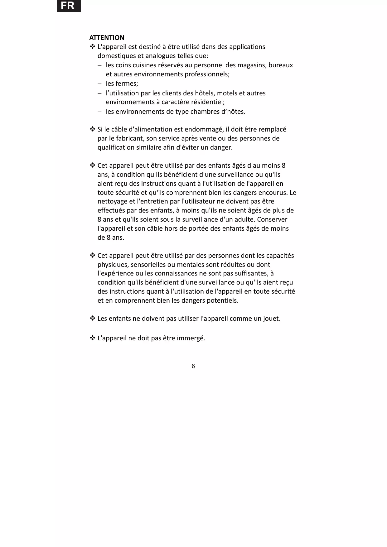 ATTENTION L'appareil est destiné à être utilisé dans des applications domestiques et analogues telles que: les coins cuisines réservés au personnel des magasins, bureaux et autres environnements professionnels; les fermes; l’utilisation par les clients des hôtels, motels et autres environnements à caractère résidentiel; les environnements de type chambres d’hôtes. Si le câble d'alimentation est endommagé, il doit être remplacé par le fabricant, son service après vente ou des personnes de qualification similaire afin d'éviter un danger. Cet appareil peut être utilisé par des enfants âgés d'au moins 8 ans, à condition qu'ils bénéficient d'une surveillance ou qu'ils aient reçu des instructions quant à l'utilisation de l'appareil en toute sécurité et qu'ils comprennent bien les dangers encourus. Le nettoyage et l'entretien par l'utilisateur ne doivent pas être effectués par des enfants, à moins qu'ils ne soient âgés de plus de 8 ans et qu'ils soient sous la surveillance d'un adulte. Conserver l'appareil et son câble hors de portée des enfants âgés de moins de 8 ans. Cet appareil peut être utilisé par des personnes dont les capacités physiques, sensorielles ou mentales sont réduites ou dont l'expérience ou les connaissances ne sont pas suffisantes, à condition qu'ils bénéficient d'une surveillance ou qu'ils aient reçu des instructions quant à l'utilisation de l'appareil en toute sécurité et en comprennent bien les dangers potentiels. Les enfants ne doivent pas utiliser l'appareil comme un jouet. L'appareil ne doit pas être immergé.