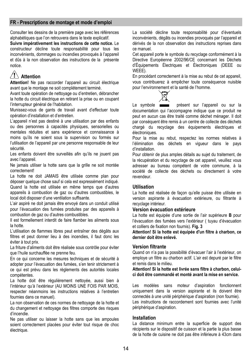 FR - Prescriptions de montage et mode d’emploi La société décline toute responsabilité pour d’éventuels inconvénients, dégâts ou incendies provoqués par l’appareil et dérivés de la non observation des instructions reprises dans ce manuel. Cet appareil porte le symbole du recyclage conformément à la Directive Européenne 2002/96/CE concernant les Déchets d’Équipements Électriques et Électroniques (DEEE ou WEEE). En procédant correctement à la mise au rebut de cet appareil, vous contribuerez à empêcher toute conséquence nuisible pour l’environnement et la santé de l’homme. Consulter les dessins de la première page avec les références alphabétiques que l’on retrouvera dans le texte explicatif. Suivre impérativement les instructions de cette notice. Le constructeur décline toute responsabilité pour tous les inconvénients, dommages ou incendies provoqués à l’appareil et dûs à la non observation des instructions de la présente notice. Attention Attention! Ne pas raccorder l’appareil au circuit électrique avant que le montage ne soit complètement terminé. Avant toute opération de nettoyage ou d’entretien, débrancher la hotte du circuit électrique en retirant la prise ou en coupant l’interrupteur général de l’habitation. Munissez-vous de gants de travail avant d’effectuer toute opération d’installation et d’entretien. L’appareil n’est pas destiné à une utilisation par des enfants ou des personnes à capacités physiques, sensorielles ou mentales réduites et sans expérience et connaissance à moins qu’ils ne soient sous la supervision ou formés sur l’utilisation de l’appareil par une personne responsable de leur sécurité. Les enfants doivent être surveillés afin qu’ils ne jouent pas avec l’appareil. Ne jamais utiliser la hotte sans que la grille ne soit montée correctement! La hotte ne doit JAMAIS être utilisée comme plan pour déposer quelque chose sauf si cela est expressément indiqué. Quand la hotte est utilisée en même temps que d’autres appareils à combustion de gaz ou d’autres combustibles, le local doit disposer d’une ventilation suffisante. L’air aspiré ne doit jamais être envoyé dans un conduit utilisé pour l’évacuation des fumées produites par des appareils à combustion de gaz ou d’autres combustibles. Il est formellement interdit de faire flamber les aliments sous la hotte. L’utilisation de flammes libres peut entraîner des dégâts aux filtres et peut donner lieu à des incendies, il faut donc les éviter à tout prix. La friture d’aliments doit être réalisée sous contrôle pour éviter que l’huile surchauffée ne prenne feu. En ce qui concerne les mesures techniques et de sécurité à adopter pour l’évacuation des fumées, s’en tenir strictement à ce qui est prévu dans les règlements des autorités locales compétentes. La hotte doit être régulièrement nettoyée, aussi bien à l’intérieur qu’à l’extérieur (AU MOINS UNE FOIS PAR MOIS, respecter néanmoins les instructions relatives à l’entretien fournies dans ce manuel). La non observation de ces normes de nettoyage de la hotte et du changement et nettoyage des filtres comporte des risques d’incendie. Ne pas utiliser ou laisser la hotte sans que les ampoules soient correctement placées pour éviter tout risque de choc électrique. Le symbole présent sur l’appareil ou sur la documentation qui l’accompagne indique que ce produit ne peut en aucun cas être traité comme déchet ménager. Il doit par conséquent être remis à un centre de collecte des déchets chargé du recyclage des équipements électriques et électroniques. Pour la mise au rebut, respectez les normes relatives à l’élimination des déchets en vigueur dans le pays d’installation. Pour obtenir de plus amples détails au sujet du traitement, de la récupération et du recyclage de cet appareil, veuillez vous adresser au bureau compétent de votre commune, à la société de collecte des déchets ou directement à votre revendeur. Utilisation La hotte est réalisée de façon qu’elle puisse être utilisée en version aspirante à évacuation extérieure, ou filtrante à recyclage intérieur. Version évacuation extérieure La hotte est équipée d’une sortie de l’air supérieure B pour l’évacuation des fumées vers l’extérieur ( tuyau d’évacuation et colliers de fixation non fournis). Fig. 3 Attention! Si la hotte est équipée d'un filtre à charbon, ce dernier doit être enlevé. Version filtrante Quand on n’a pas la possibilité d’évacuer l’air à l’extérieur, on employe un filtre au charbon actif. L’air est depuré par le filtre et remis dans le milieu. Attention! Si la hotte est livrée sans filtre à charbon, celuici doit être commandé et monté avant la mise en service. Les modèles sans moteur d’aspiration fonctionnent uniquement dans la version aspirante et ils doivent être connectés à une unité périphérique d’aspiration (non fournie). Les instructions de raccordement sont fournies avec l’unité périphérique d’aspiration. Installation La distance minimum entre la superficie de support des récipients sur le dispositif de cuisson et la partie la plus basse de la hotte de cuisine ne doit pas être inférieure à 43cm dans