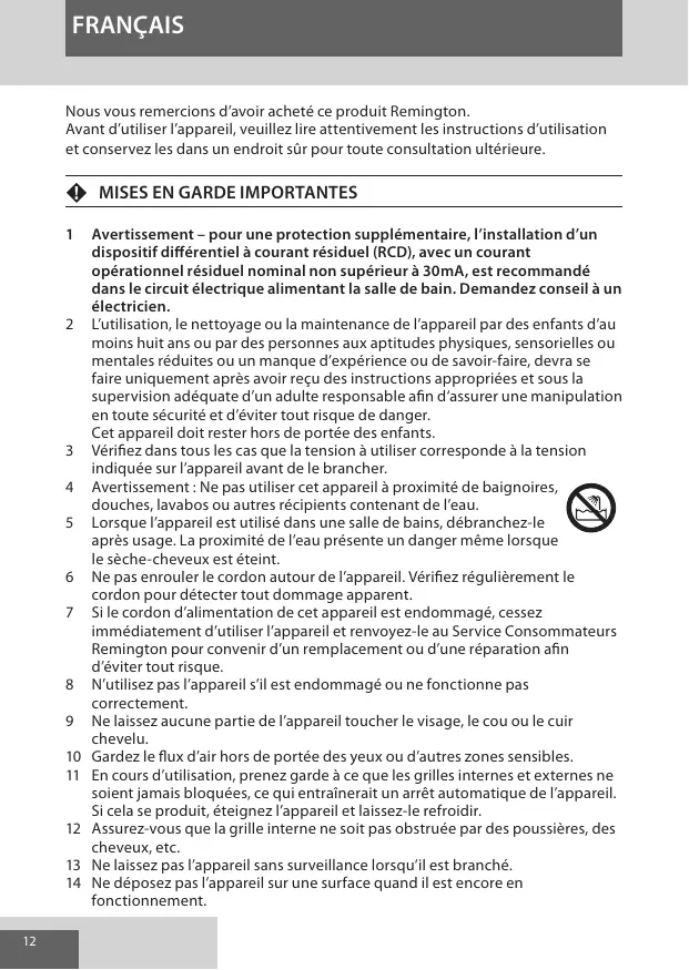 7 Si le cordon d'alimentation de cet apparéil est endommagé, cessez immédiatement d'utiliser l' apparéil et renvoyez-le au Service Consommateurs. Remington pour convenir d'un remplacement ou d'une réparation afin d'éviter tout risque.