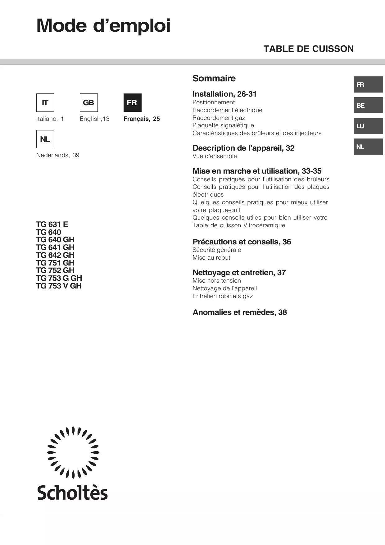 TG 631 EWH BLANC - Table de cuisson SCHOLTES - Notice d'utilisation et mode d'emploi gratuit