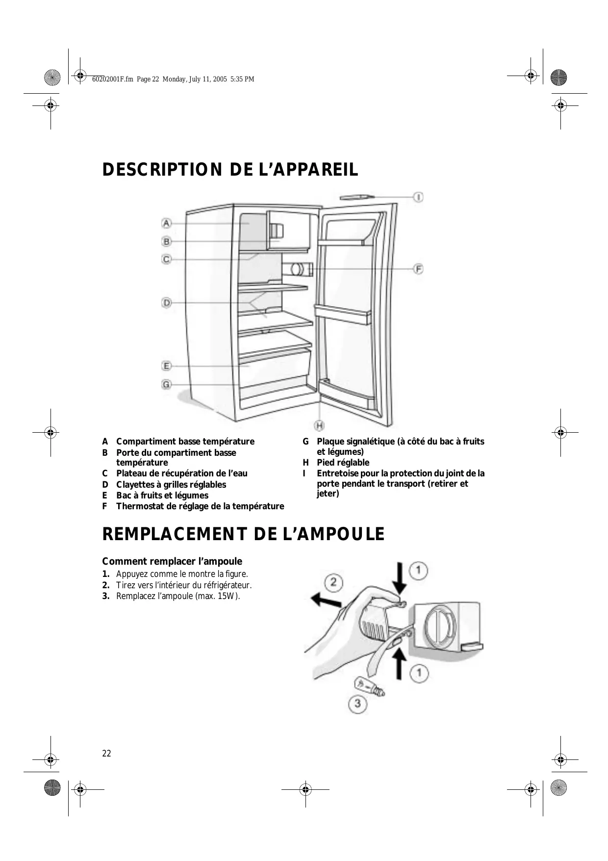 A Compartiment basse température B Porte du compartiment basse température C Plateau de récupération de l’eau D Clayettes à grilles réglables E Bac à fruits et légumes F Thermostat de réglage de la température G Plaque signalétique (à côté du bac à fruits et légumes) H Pied réglable I Entretoise pour la protection du joint de la porte pendant le transport (retirer et jeter)