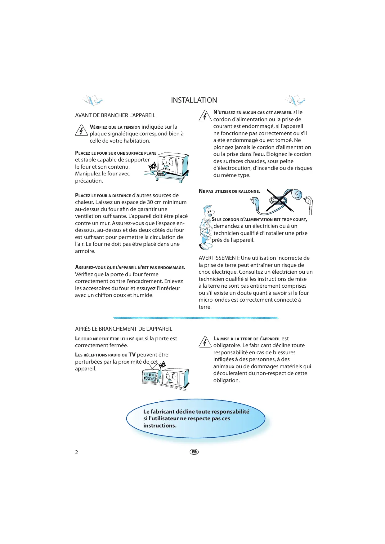 LE FOUR NE PEUT ÊTRE UTILISÉ QUE si la porte est correctement fermée. LA MISE À LA TERRE DE L'APPAREIL est obligatoire. Le fabricant décline toute responsabilité en cas de blessures infligées à des personnes, à des animaux ou de dommages matériels qui découleraient du non-respect de cette obligation. LES RÉCEPTIONS RADIO OU TV peuvent être perturbées par la proximité de cet appareil. Le fabricant décline toute responsabilité si l'utilisateur ne respecte pas ces instructions.