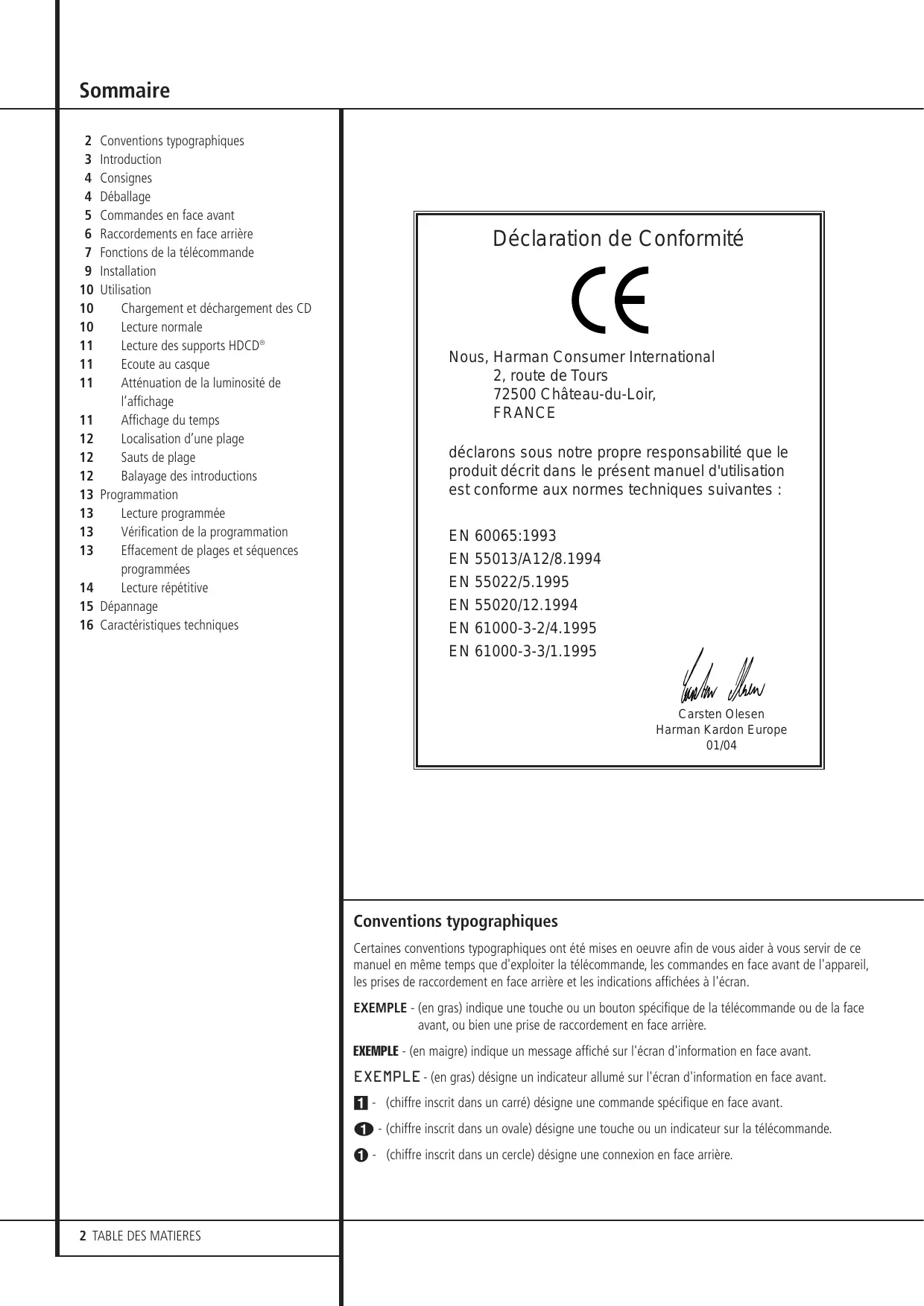 Conventions typographiques Introduction Consignes Déballage Commandes en face avant Raccordements en face arrière Fonctions de la télécommande Installation Utilisation Chargement et déchargement des CD Lecture normale Lecture des supports HDCD® Ecoute au casque Atténuation de la luminosité de l’affichage Affichage du temps Localisation d’une plage Sauts de plage Balayage des introductions Programmation Lecture programmée Vérification de la programmation Effacement de plages et séquences programmées Lecture répétitive Dépannage Caractéristiques techniques Déclaration de Conformité Nous, Harman Consumer International 2, route de Tours 72500 Château-du-Loir, FRANCE déclarons sous notre propre responsabilité que le produit décrit dans le présent manuel d'utilisation est conforme aux normes techniques suivantes : EN 60065:1993 EN 55013/A12/8.1994 EN 55022/5.1995 EN 55020/12.1994 EN 61000-3-2/4.1995 EN 61000-3-3/1.1995 Carsten Olesen Harman Kardon Europe 01/04 Conventions typographiques Certaines conventions typographiques ont été mises en oeuvre afin de vous aider à vous servir de ce manuel en même temps que d'exploiter la télécommande, les commandes en face avant de l'appareil, les prises de raccordement en face arrière et les indications affichées à l'écran. EXEMPLE - (en gras) indique une touche ou un bouton spécifique de la télécommande ou de la face avant, ou bien une prise de raccordement en face arrière. EXEMPLE - (en maigre) indique un message affiché sur l'écran d'information en face avant. EXEMPLE - (en gras) désigne un indicateur allumé sur l'écran d'information en face avant.