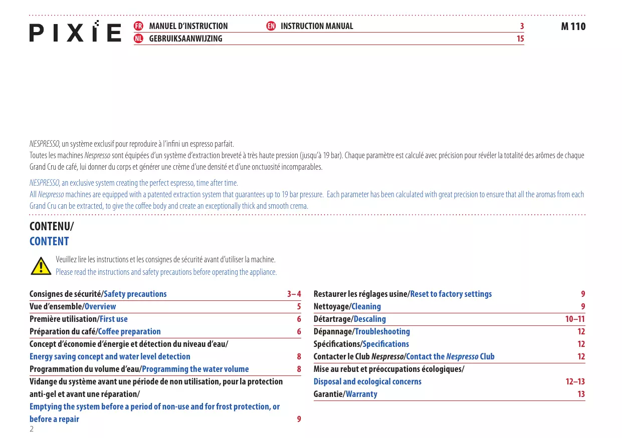 M 110 NESPRESSO, un système exclusif pour reproduire à l’infini un espresso parfait. Toutes les machines Nespresso sont équipées d’un système d’extraction breveté à très haute pression (jusqu’à 19 bar). Chaque paramètre est calculé avec précision pour révéler la totalité des arômes de chaque Grand Cru de café, lui donner du corps et générer une crème d’une densité et d’une onctuosité incomparables. NESPRESSO, an exclusive system creating the perfect espresso, time after time. All Nespresso machines are equipped with a patented extraction system that guarantees up to 19 bar pressure. Each parameter has been calculated with great precision to ensure that all the aromas from each Grand Cru can be extracted, to give the coffee body and create an exceptionally thick and smooth crema. CONTENU/ CONTENT Veuillez lire les instructions et les consignes de sécurité avant d’utiliser la machine. Please read the instructions and safety precautions before operating the appliance. Consignes de sécurité/Safety precautions 3– 4 Vue d’ensemble/Overview Première utilisation/First use Préparation du café/Coffee preparation Concept d’économie d’énergie et détection du niveau d’eau/ Energy saving concept and water level detection Programmation du volume d’eau/Programming the water volume Vidange du système avant une période de non utilisation, pour la protection anti-gel et avant une réparation/ Emptying the system before a period of non-use and for frost protection, or before a repair
