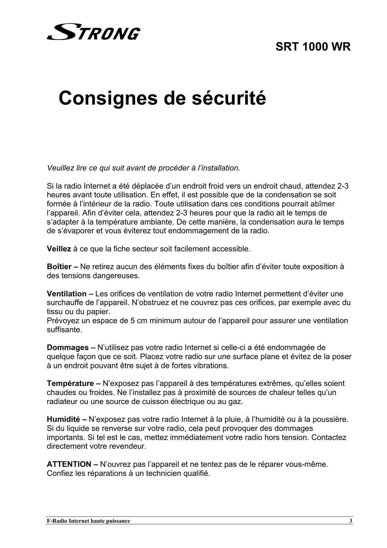 - Informations sur les licences F-Radio Internet haute puissance Table des matières 2 SRT 1000 WR Consignes de sécurité Veuillez lire ce qui suit avant de procéder à l’installation. Si la radio Internet a été déplacée d’un endroit froid vers un endroit chaud, attendez 2-3 heures avant toute utilisation. En effet, il est possible que de la condensation se soit formée à l’intérieur de la radio. Toute utilisation dans ces conditions pourrait abîmer l’appareil. Afin d’éviter cela, attendez 2-3 heures pour que la radio ait le temps de s’adapter à la température ambiante. De cette manière, la condensation aura le temps de s’évaporer et vous éviterez tout endommagement de la radio. Veillez à ce que la fiche secteur soit facilement accessible. Boîtier – Ne retirez aucun des éléments fixes du boîtier afin d’éviter toute exposition à des tensions dangereuses. Ventilation – Les orifices de ventilation de votre radio Internet permettent d’éviter une surchauffe de l’appareil. N’obstruez et ne couvrez pas ces orifices, par exemple avec du tissu ou du papier. Prévoyez un espace de 5 cm minimum autour de l’appareil pour assurer une ventilation suffisante. Dommages – N’utilisez pas votre radio Internet si celle-ci a été endommagée de quelque façon que ce soit. Placez votre radio sur une surface plane et évitez de la poser à un endroit pouvant être sujet à de fortes vibrations. Température – N’exposez pas l’appareil à des températures extrêmes, qu’elles soient chaudes ou froides. Ne l’installez pas à proximité de sources de chaleur telles qu’un radiateur ou une source de cuisson électrique ou au gaz. Humidité – N’exposez pas votre radio Internet à la pluie, à l’humidité ou à la poussière. Si du liquide se renverse sur votre radio, cela peut provoquer des dommages importants. Si tel est le cas, mettez immédiatement votre radio hors tension. Contactez directement votre revendeur. ATTENTION – N’ouvrez pas l’appareil et ne tentez pas de le réparer vous-même. Confiez les réparations à un technicien qualifié. F-Radio Internet haute puissance p. 25