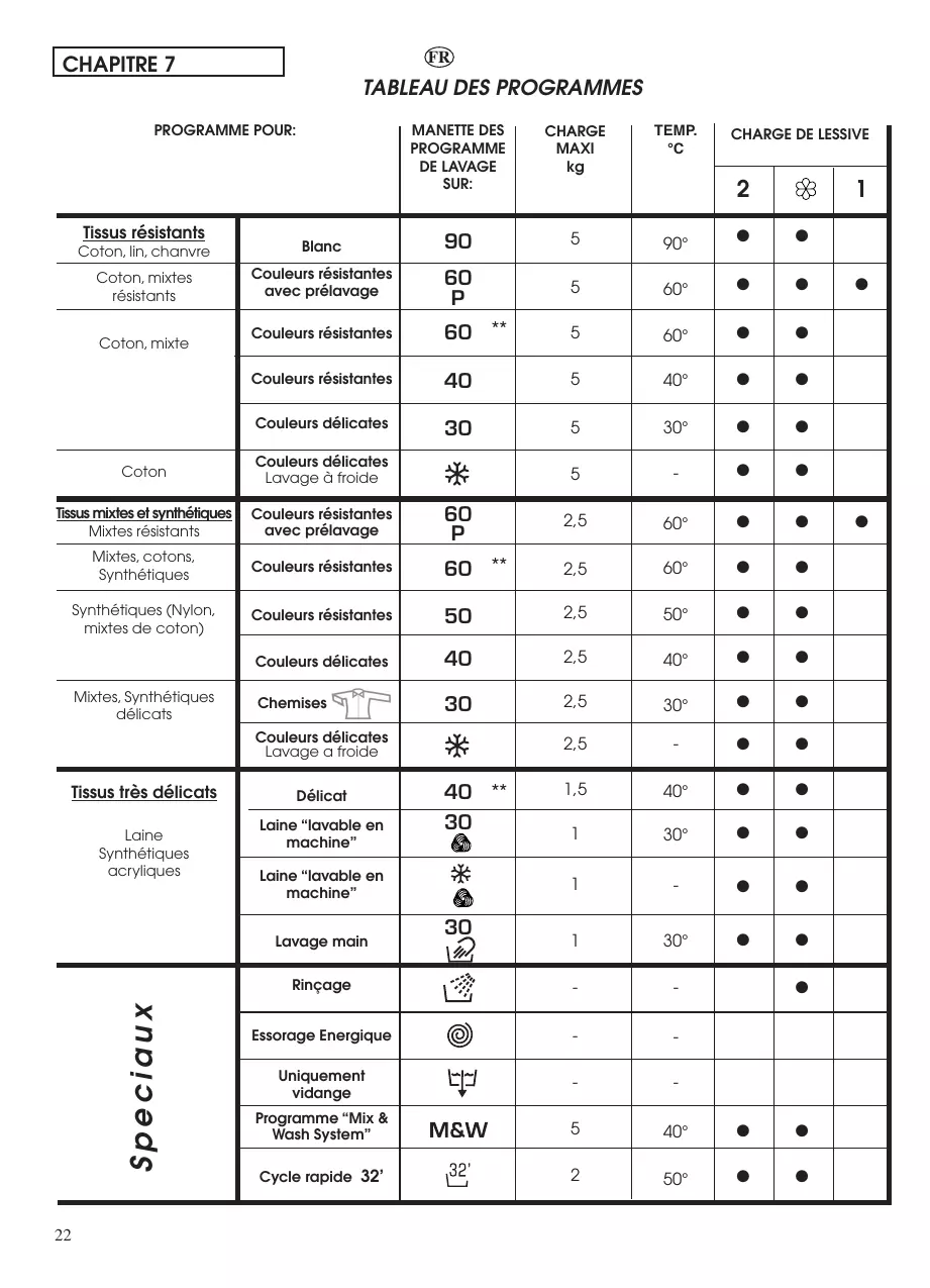 PROGRAMME “RAPIDE 32 MINUTES” Ce programme permet d’effectuer un cycle de lavage complet en 30 minutes environ pour des charges de linge jusqu’à 2 kg et à une température de 50°C. Quand vous sélectionnez le programme "Rapide 32 minutes", nous vous recommandons d'utiliser seulement 20% de la quantité indiquée sur la boîte de produit.
