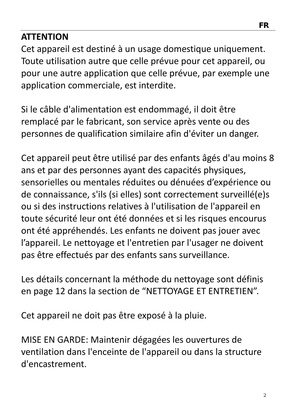 ATTENTION Cet appareil est destiné à un usage domestique uniquement. Toute utilisation autre que celle prévue pour cet appareil, ou pour une autre application que celle prévue, par exemple une application commerciale, est interdite. Si le câble d'alimentation est endommagé, il doit être remplacé par le fabricant, son service après vente ou des personnes de qualification similaire afin d'éviter un danger. Cet appareil peut être utilisé par des enfants âgés d'au moins 8 ans et par des personnes ayant des capacités physiques, sensorielles ou mentales réduites ou dénuées d’expérience ou de connaissance, s'ils (si elles) sont correctement surveillé(e)s ou si des instructions relatives à l'utilisation de l'appareil en toute sécurité leur ont été données et si les risques encourus ont été appréhendés. Les enfants ne doivent pas jouer avec l’appareil. Le nettoyage et l'entretien par l'usager ne doivent pas être effectués par des enfants sans surveillance. Les détails concernant la méthode du nettoyage sont définis en page 12 dans la section de “NETTOYAGE ET ENTRETIEN”. Cet appareil ne doit pas être exposé à la pluie. MISE EN GARDE: Maintenir dégagées les ouvertures de ventilation dans l'enceinte de l'appareil ou dans la structure d'encastrement.