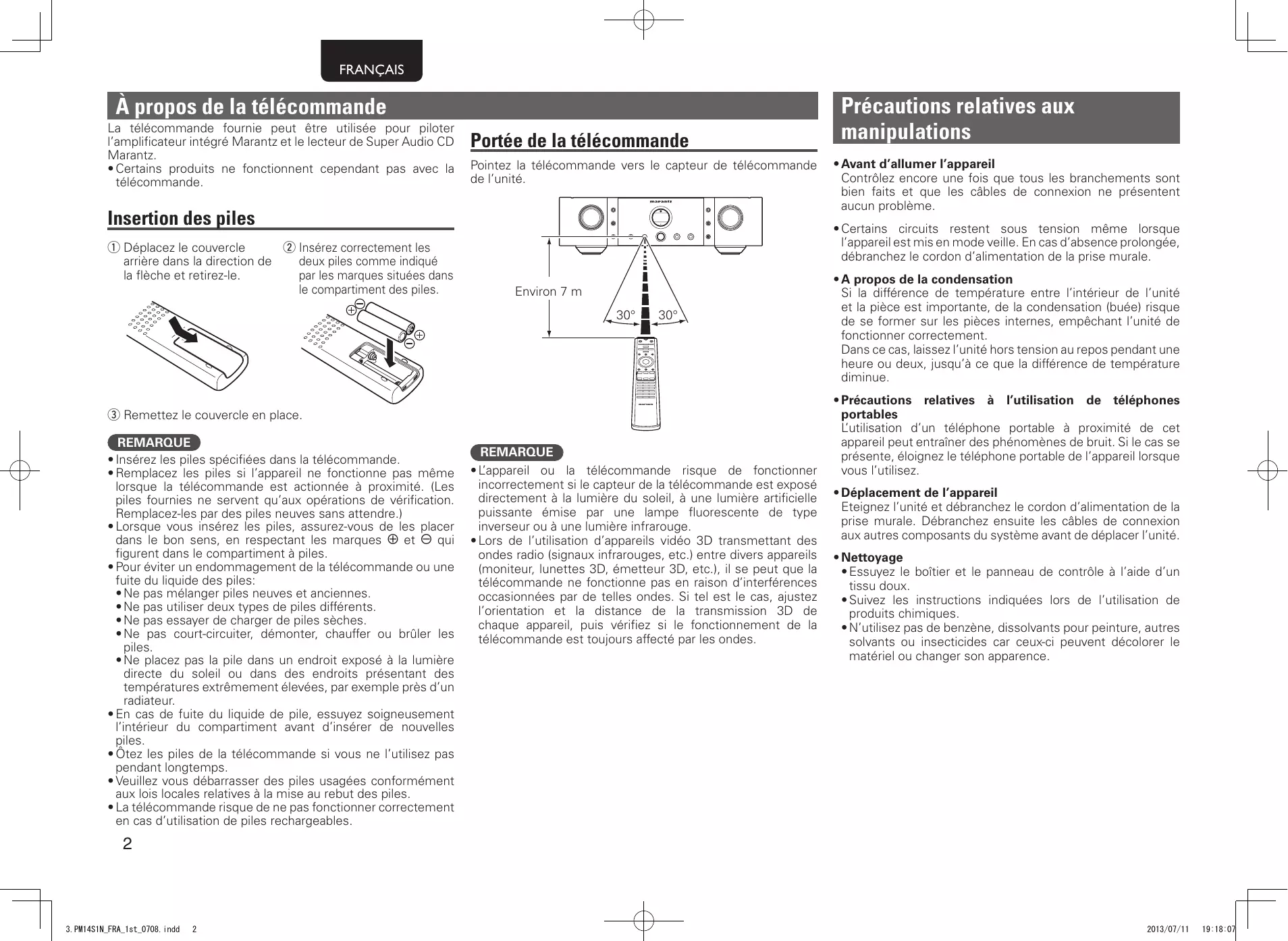 À propos de la télécommande La télécommande fournie peut être utilisée pour piloter l’amplificateur intégré Marantz et le lecteur de Super Audio CD Marantz. • Certains produits ne fonctionnent cependant pas avec la télécommande.