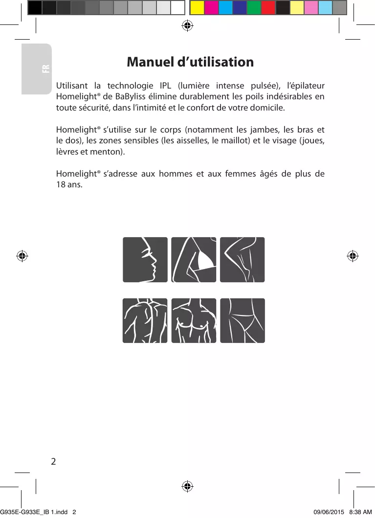 Manuel d’utilisation Utilisant la technologie IPL (lumière intense pulsée), l’épilateur Homelight® de BaByliss élimine durablement les poils indésirables en toute sécurité, dans l’intimité et le confort de votre domicile. Homelight® s’utilise sur le corps (notamment les jambes, les bras et le dos), les zones sensibles (les aisselles, le maillot) et le visage (joues, lèvres et menton). Homelight® s’adresse aux hommes et aux femmes âgés de plus de 18 ans.