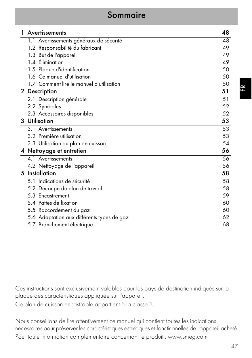Ces instructions sont exclusivement valables pour les pays de destination indiqués sur la plaque des caractéristiques appliquée sur l'appareil. Ce plan de cuisson encastrable appartient à la classe 3. Nous conseillons de lire attentivement ce manuel qui contient toutes les indications nécessaires pour préserver les caractéristiques esthétiques et fonctionnelles de l'appareil acheté. Pour toute information complémentaire concernant le produit : www.smeg.com