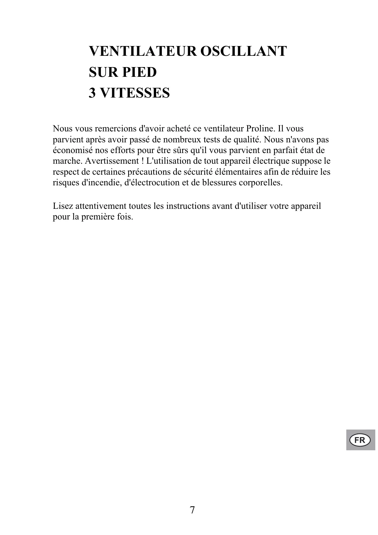 Nous vous remercions d'avoir acheté ce ventilateur Proline. Il vous parvient après avoir passé de nombreux tests de qualité. Nous n'avons pas économisé nos efforts pour être sûrs qu'il vous parvient en parfait état de marche. Avertissement ! L'utilisation de tout appareil électrique suppose le respect de certaines précautions de sécurité élémentaires afin de réduire les risques d'incendie, d'électrocution et de blessures corporelles. Lisez attentivement toutes les instructions avant d'utiliser votre appareil pour la première fois.