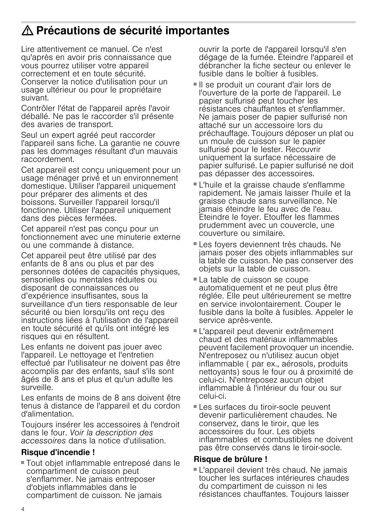 : Précautions de sécurité importantes Lire attentivement ce manuel. Ce n'est qu'après en avoir pris connaissance que vous pourrez utiliser votre appareil correctement et en toute sécurité. Conserver la notice d'utilisation pour un usage ultérieur ou pour le propriétaire suivant. Contrôler l'état de l'appareil après l'avoir déballé. Ne pas le raccorder s'il présente des avaries de transport. Seul un expert agréé peut raccorder l'appareil sans fiche. La garantie ne couvre pas les dommages résultant d'un mauvais raccordement. Cet appareil est conçu uniquement pour un usage ménager privé et un environnement domestique. Utiliser l'appareil uniquement pour préparer des aliments et des boissons. Surveiller l'appareil lorsqu'il fonctionne. Utiliser l'appareil uniquement dans des pièces fermées. Cet appareil n'est pas conçu pour un fonctionnement avec une minuterie externe ou une commande à distance. Cet appareil peut être utilisé par des enfants de 8 ans ou plus et par des personnes dotées de capacités physiques, sensorielles ou mentales réduites ou disposant de connaissances ou d’expérience insuffisantes, sous la surveillance d'un tiers responsable de leur sécurité ou bien lorsqu'ils ont reçu des instructions liées à l'utilisation de l'appareil en toute sécurité et qu'ils ont intégré les risques qui en résultent. Les enfants ne doivent pas jouer avec l'appareil. Le nettoyage et l'entretien effectué par l'utilisateur ne doivent pas être accomplis par des enfants, sauf s'ils sont âgés de 8 ans et plus et qu'un adulte les surveille. Les enfants de moins de 8 ans doivent être tenus à distance de l'appareil et du cordon d'alimentation. Toujours insérer les accessoires à l'endroit dans le four. Voir la description des accessoires dans la notice d'utilisation. Risque d'incendie ! ■ Tout objet inflammable entreposé dans le compartiment de cuisson peut s'enflammer. Ne jamais entreposer d'objets inflammables dans le compartiment de cuisson. Ne jamais