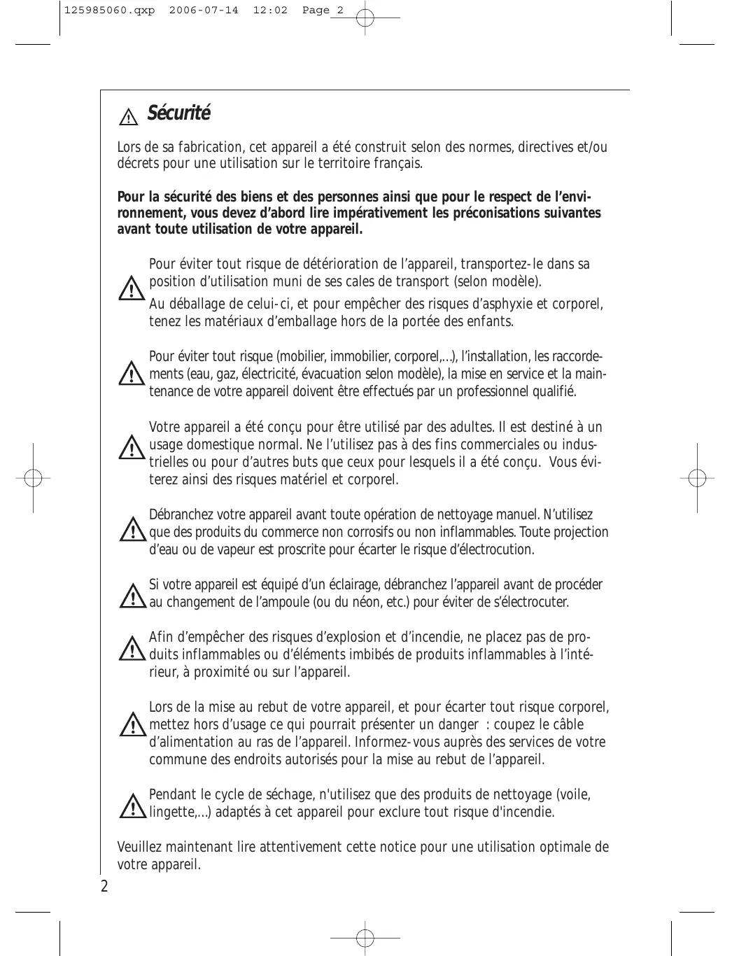 125985060.qxp 2006-07-14 12:02 Page 2 Sécurité Lors de sa fabrication, cet appareil a été construit selon des normes, directives et/ou décrets pour une utilisation sur le territoire français. Pour la sécurité des biens et des personnes ainsi que pour le respect de l’environnement, vous devez d’abord lire impérativement les préconisations suivantes avant toute utilisation de votre appareil. Pour éviter tout risque de détérioration de l’appareil, transportez-le dans sa position d’utilisation muni de ses cales de transport (selon modèle). Au déballage de celui-ci, et pour empêcher des risques d’asphyxie et corporel, tenez les matériaux d’emballage hors de la portée des enfants. Pour éviter tout risque (mobilier, immobilier, corporel,…), l’installation, les raccordements (eau, gaz, électricité, évacuation selon modèle), la mise en service et la maintenance de votre appareil doivent être effectués par un professionnel qualifié. Votre appareil a été conçu pour être utilisé par des adultes. Il est destiné à un usage domestique normal. Ne l’utilisez pas à des fins commerciales ou industrielles ou pour d’autres buts que ceux pour lesquels il a été conçu. Vous éviterez ainsi des risques matériel et corporel. Débranchez votre appareil avant toute opération de nettoyage manuel. N’utilisez que des produits du commerce non corrosifs ou non inflammables. Toute projection d’eau ou de vapeur est proscrite pour écarter le risque d’électrocution. Si votre appareil est équipé d’un éclairage, débranchez l’appareil avant de procéder au changement de l’ampoule (ou du néon, etc.) pour éviter de s’électrocuter. Afin d’empêcher des risques d’explosion et d’incendie, ne placez pas de produits inflammables ou d’éléments imbibés de produits inflammables à l’intérieur, à proximité ou sur l’appareil. Lors de la mise au rebut de votre appareil, et pour écarter tout risque corporel, mettez hors d’usage ce qui pourrait présenter un danger : coupez le câble d’alimentation au ras de l’appareil. Informez-vous auprès des services de votre commune des endroits autorisés pour la mise au rebut de l’appareil. Pendant le cycle de séchage, n'utilisez que des produits de nettoyage (voile, lingette,…) adaptés à cet appareil pour exclure tout risque d'incendie. Veuillez maintenant lire attentivement cette notice pour une utilisation optimale de votre appareil.