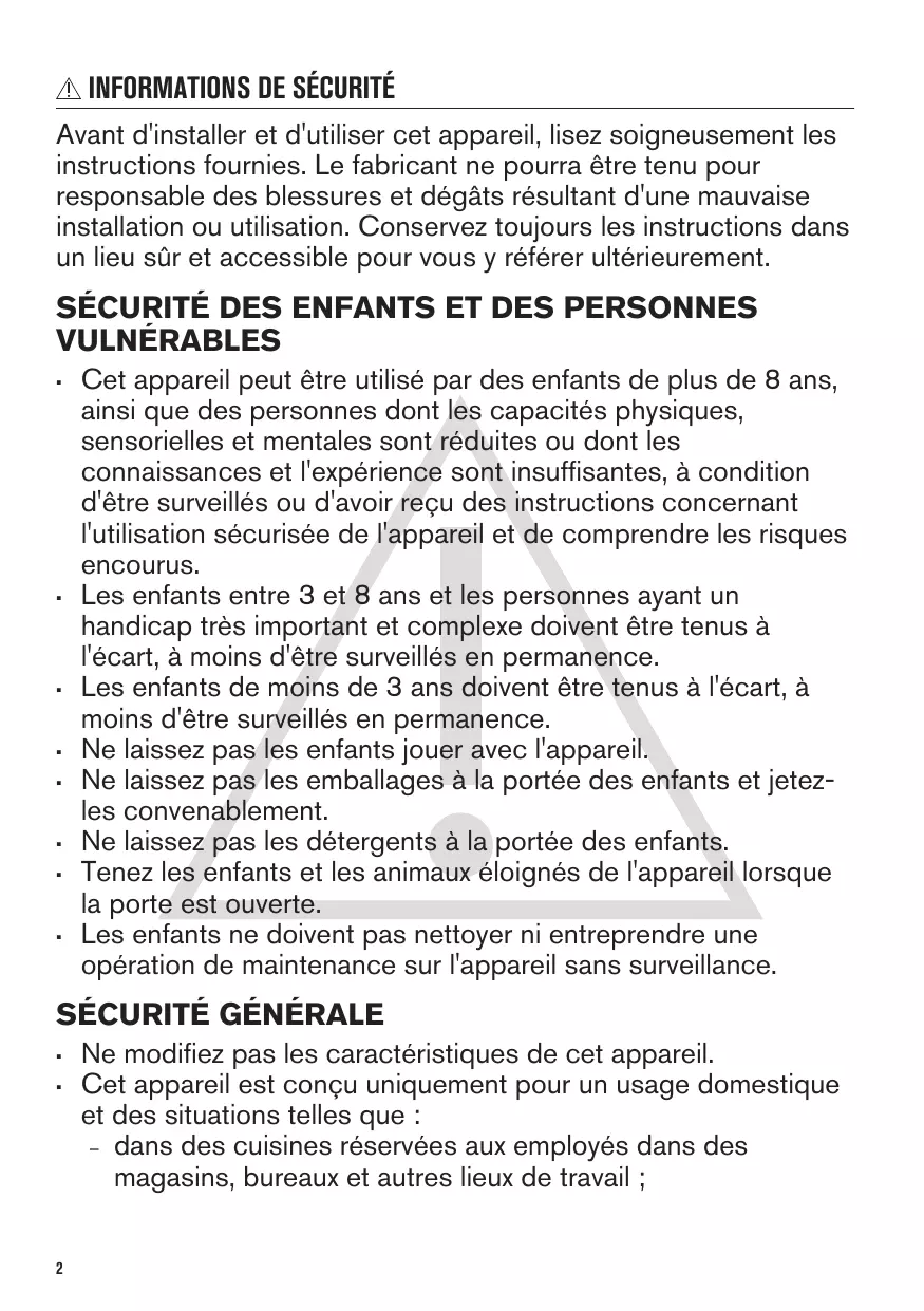 Cet appareil peut être utilisé par des enfants de plus de 8 ans, ainsi que des personnes dont les capacités physiques, sensorielles et mentales sont réduites ou dont les connaissances et l'expérience sont insuffisantes, à condition d'être surveillés ou d'avoir reçu des instructions concernant l'utilisation sécurisée de l'appareil et de comprendre les risques encourus. Les enfants entre 3 et 8 ans et les personnes ayant un handicap très important et complexe doivent être tenus à l'écart, à moins d'être surveillés en permanence. Les enfants de moins de 3 ans doivent être tenus à l'écart, à moins d'être surveillés en permanence. Ne laissez pas les enfants jouer avec l'appareil. Ne laissez pas les emballages à la portée des enfants et jetezles convenablement. Ne laissez pas les détergents à la portée des enfants. Tenez les enfants et les animaux éloignés de l'appareil lorsque la porte est ouverte. Les enfants ne doivent pas nettoyer ni entreprendre une opération de maintenance sur l'appareil sans surveillance.