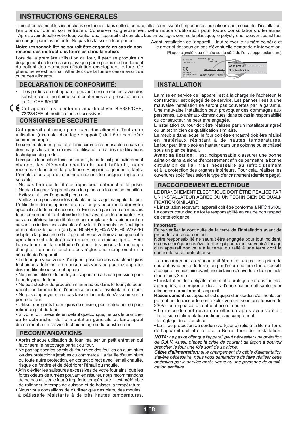USER INSTRUCTIONS OVENS INSTRUCTIONS GENERALES - Lire attentivement les instructions contenues dans cette brochure, elles fournissent d’importantes indications sur la sécurité d’installation, l’emploi du four et son entretien. Conserver soigneusement cette notice d’utilisation pour toutes consultations ultérieures. - Après avoir déballé votre four, vérifier que l’appareil est complet. Les emballages comme le plastique, le polystyrène, peuvent constituer un danger pour les enfants. Ne pas les laisser à leur portée. Avant installation de l'appareil, il faut relever le numéro de série et Notre responsabilité ne saurait être engagée en cas de non le noter ci-dessous en cas d'éventuelle demande d'intervention. respect des instructions fournies dans la notice. Plaque signalétique (située sur le côté de l’enveloppe extérieure) Lors de la première utilisation du four, il peut se produire un dégagement de fumée âcre provoqué par le premier échauffement du collant des panneaux d’isolation enveloppant le four. Ce phénomène est normal. Attendez que la fumée cesse avant de cuire des aliments. DECLARATION DE CONFORMITÉ: